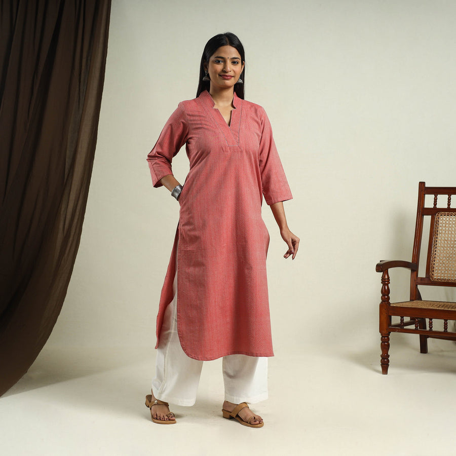 Look stylish and stay comfortable with this red jhiri handloom straight cotton kurta, made using traditional weaving techniques from Rajasthan. It also features a convenient one-side pocket, making it perfect for casual outings and festive occasions.