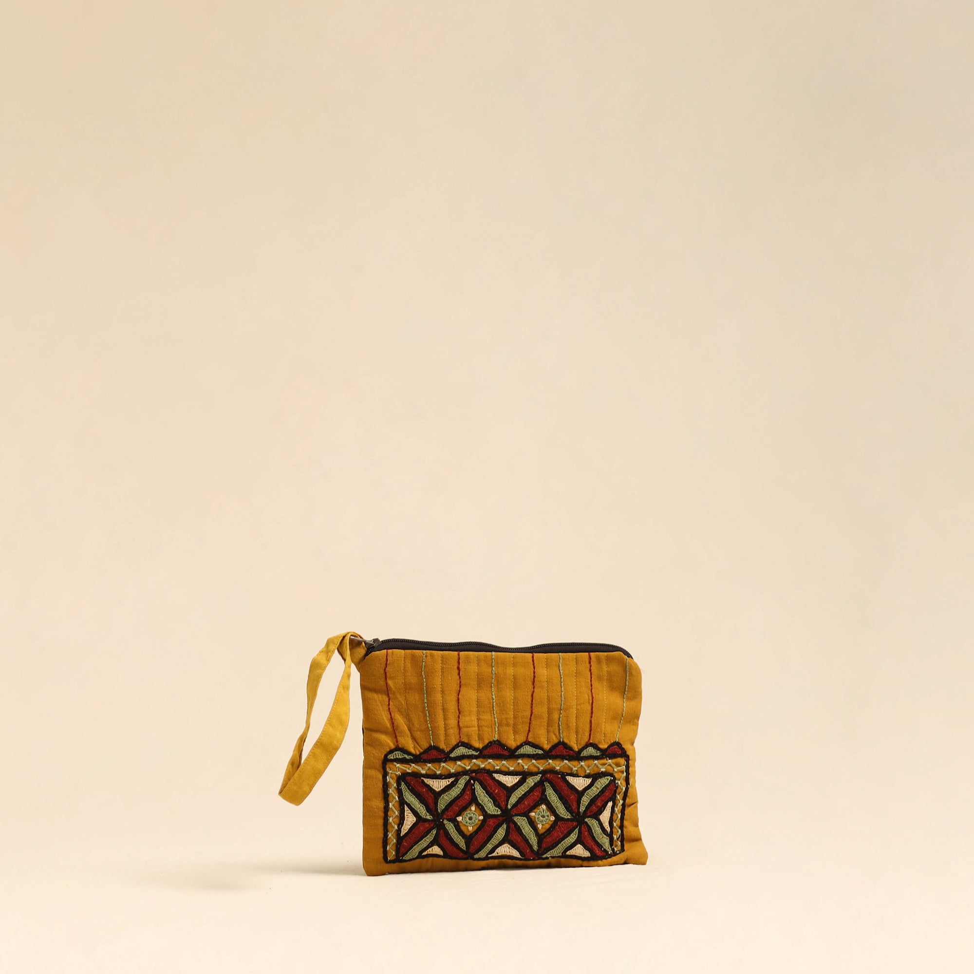 Fine quality kala raksha jat hand embroidered cotton coin purse. Garasia Jat work similarly "belongs" specifically to Garasia Jats, Islamic pastoralists who originated outside of Kutch. Garasia women stitch an array of geometric patterns in counted work based on cross stitch studded with minute mirrors to completely fill the yokes of their churi, a long gown. This style, displaying comprehension of the structure of fabric, is unique in Kutch and Sindh.