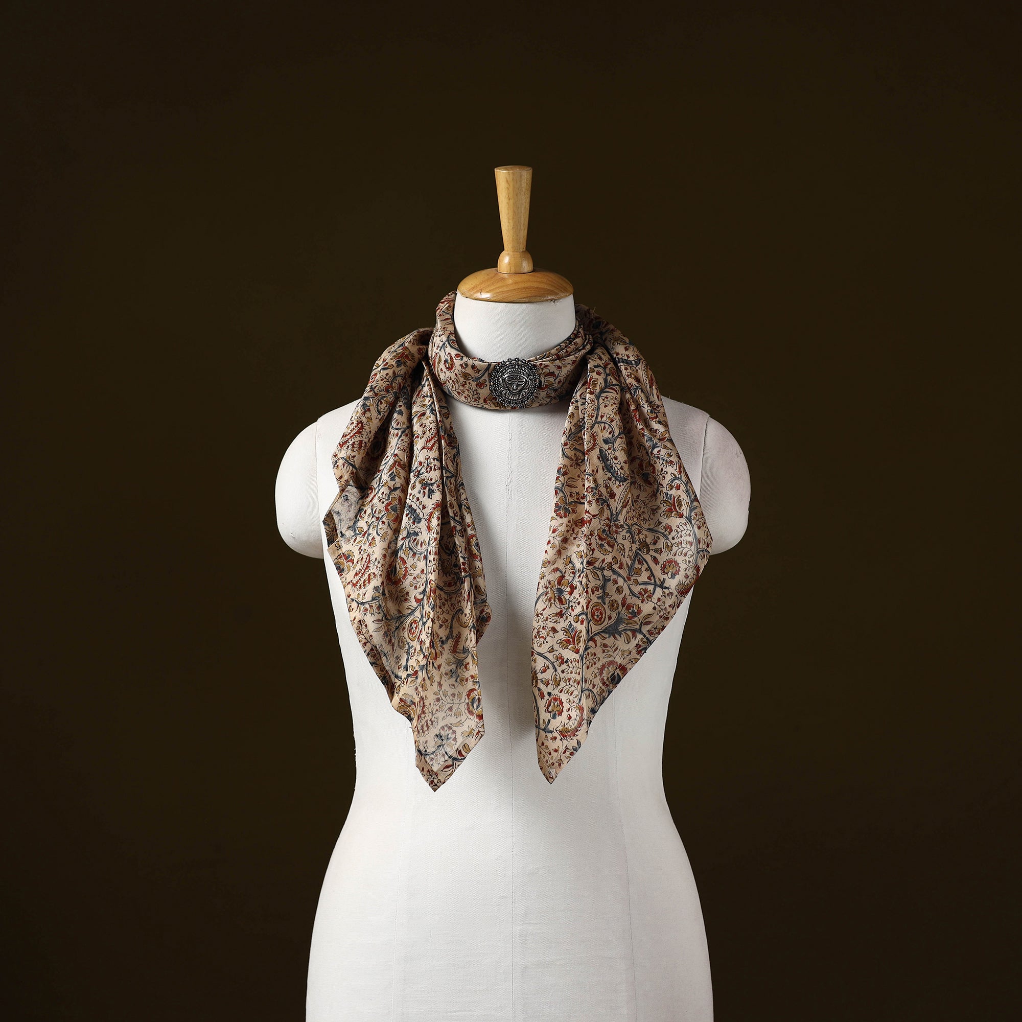 Beige kalamkari block print german silver brooch scarf is a versatile accessory designed for effortless styling. Soft and comfortable to wear, it features detailed block-printed motifs that add a distinctive touch. Made using chanderi silk cotton, the scarf offers a balanced feel with a subtle sheen and a comfortable drape, making it suitable for everyday as well as occasion wear.