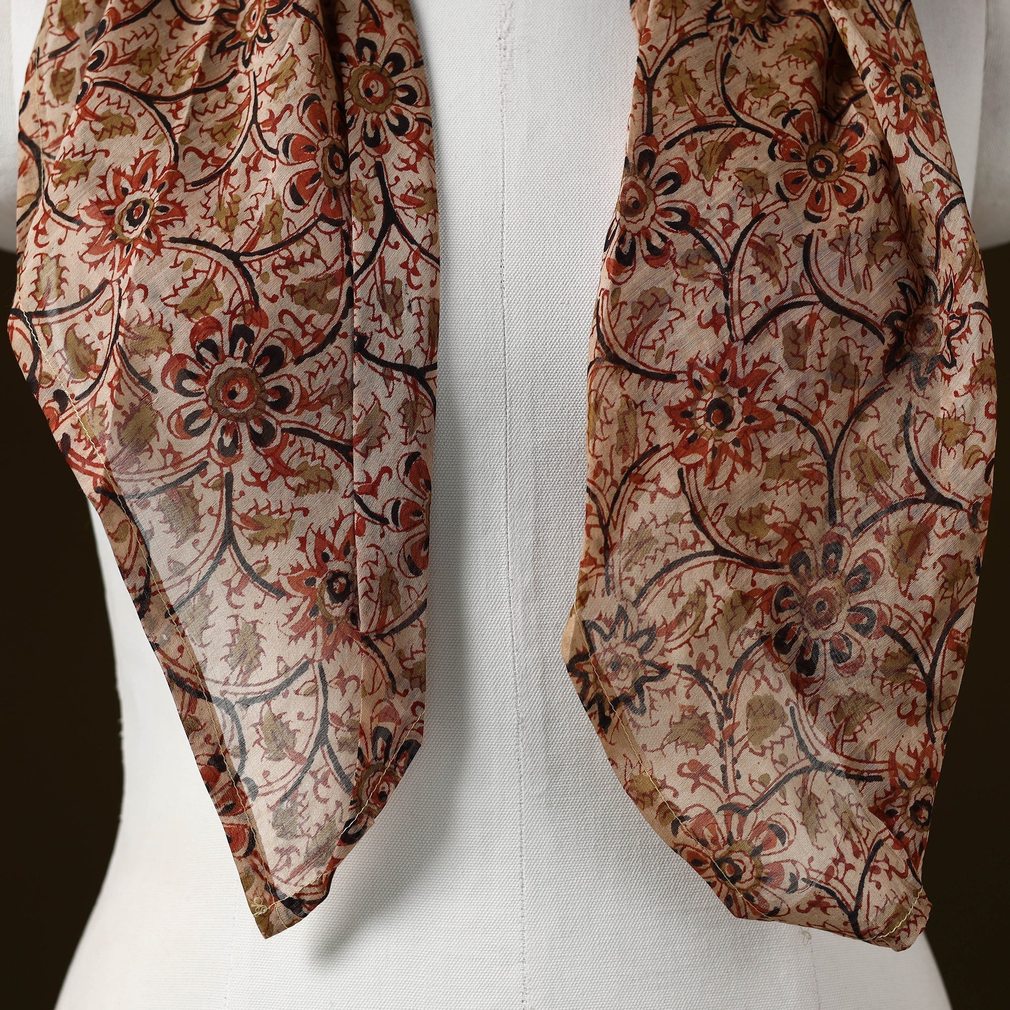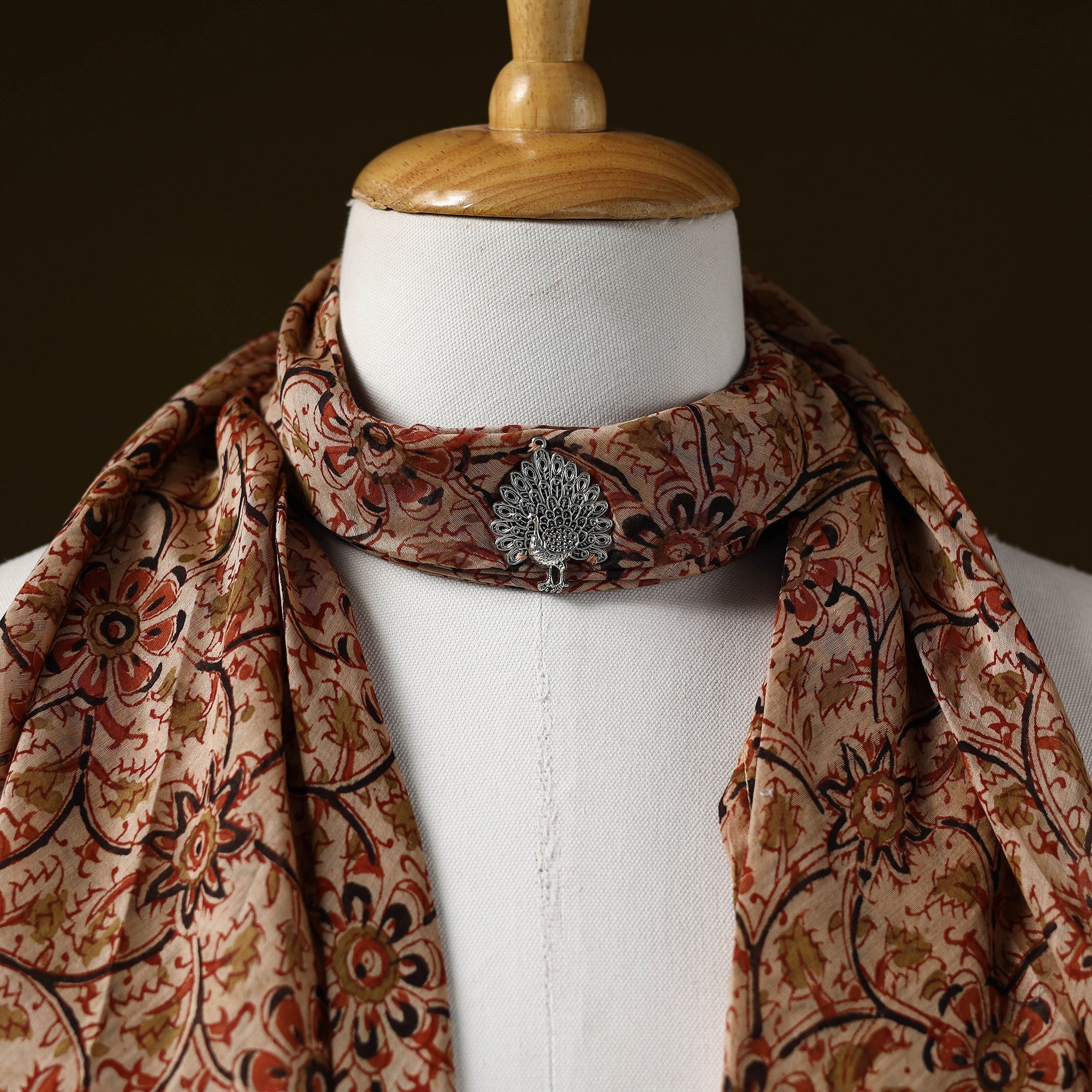 | Material | Beige kalamkari block print german silver brooch scarf is a versatile accessory designed for effortless styling. Soft and comfortable to wear, it features detailed block-printed motifs that add a distinctive touch. Made using chanderi silk cotton, the scarf offers a balanced feel with a subtle sheen and a comfortable drape, making it suitable for everyday as well as occasion wear. |