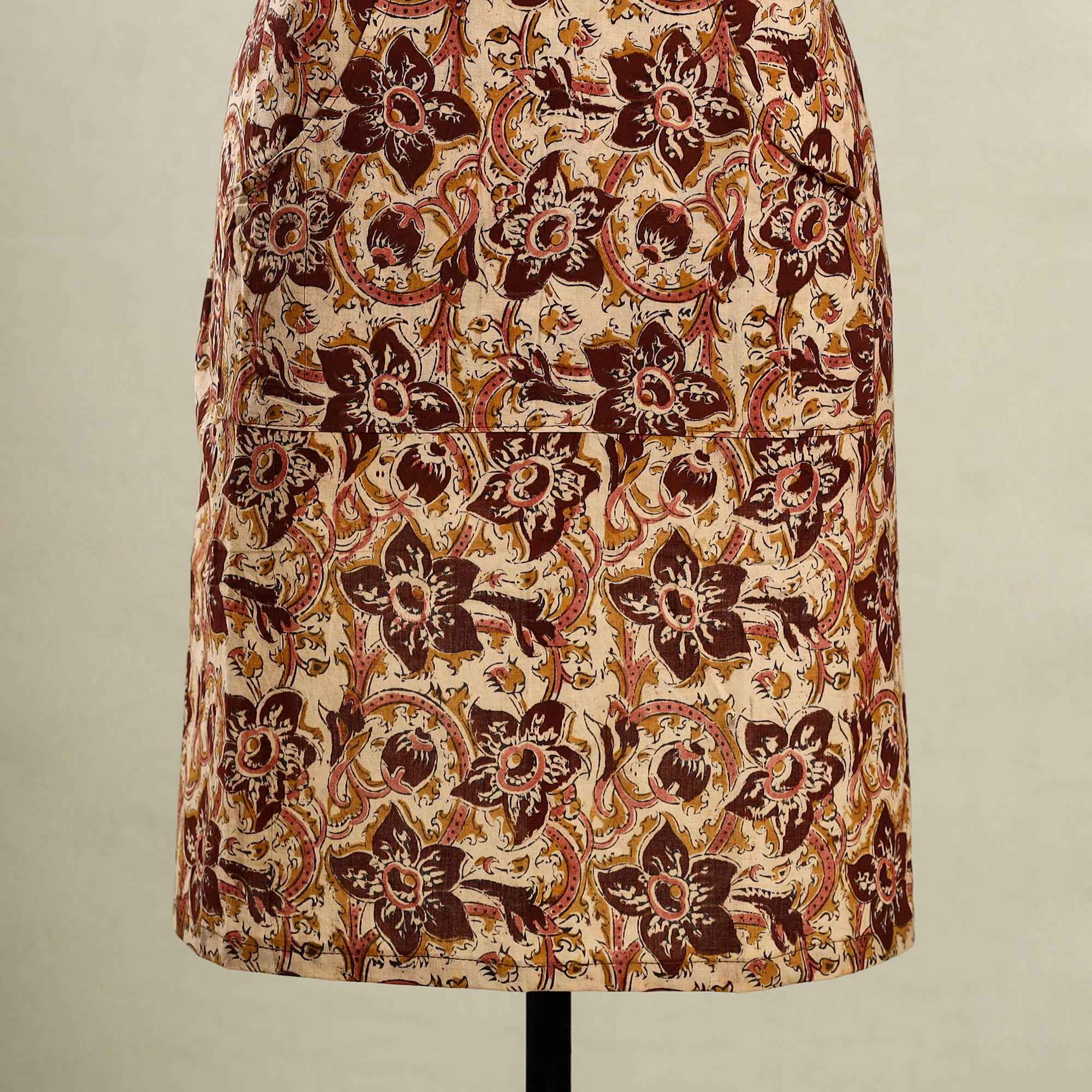 This brown cotton apron features traditional kalamkari block prints, adding a handcrafted touch to your daily kitchen routine. It includes an adjustable neck strap and a spacious front pocket for convenience. The intricate patterns reflect the heritage of Andhra Pradesh’s kalamkari art, practiced by skilled artisans using wooden blocks. Comfortable and practical, it’s great for cooking or baking. It brings a simple, functional style to your kitchen, making everyday tasks feel more special.