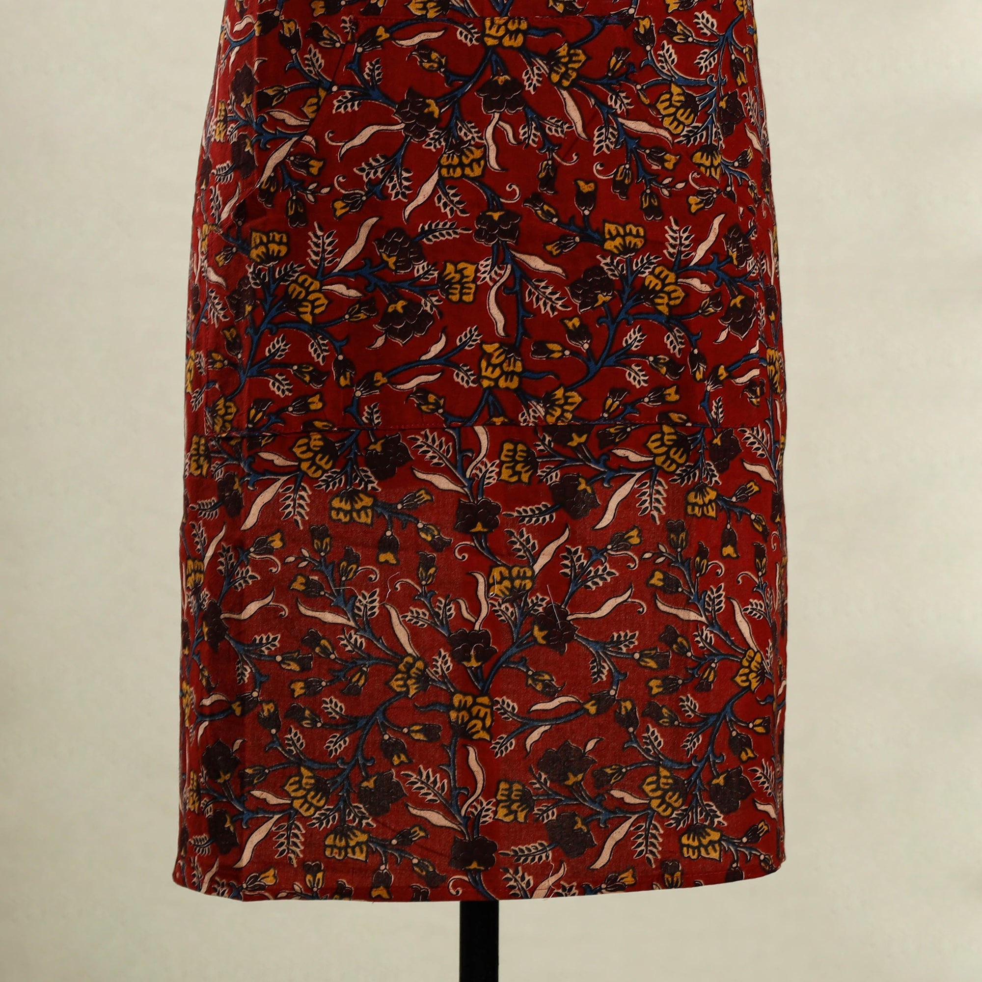 This red cotton apron features traditional kalamkari block prints, adding a handcrafted touch to your daily kitchen routine. It includes an adjustable neck strap and a spacious front pocket for convenience. The intricate patterns reflect the heritage of Andhra Pradesh’s kalamkari art, practiced by skilled artisans using wooden blocks. Comfortable and practical, it’s great for cooking or baking. It brings a simple, functional style to your kitchen, making everyday tasks feel more special.