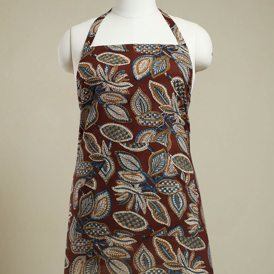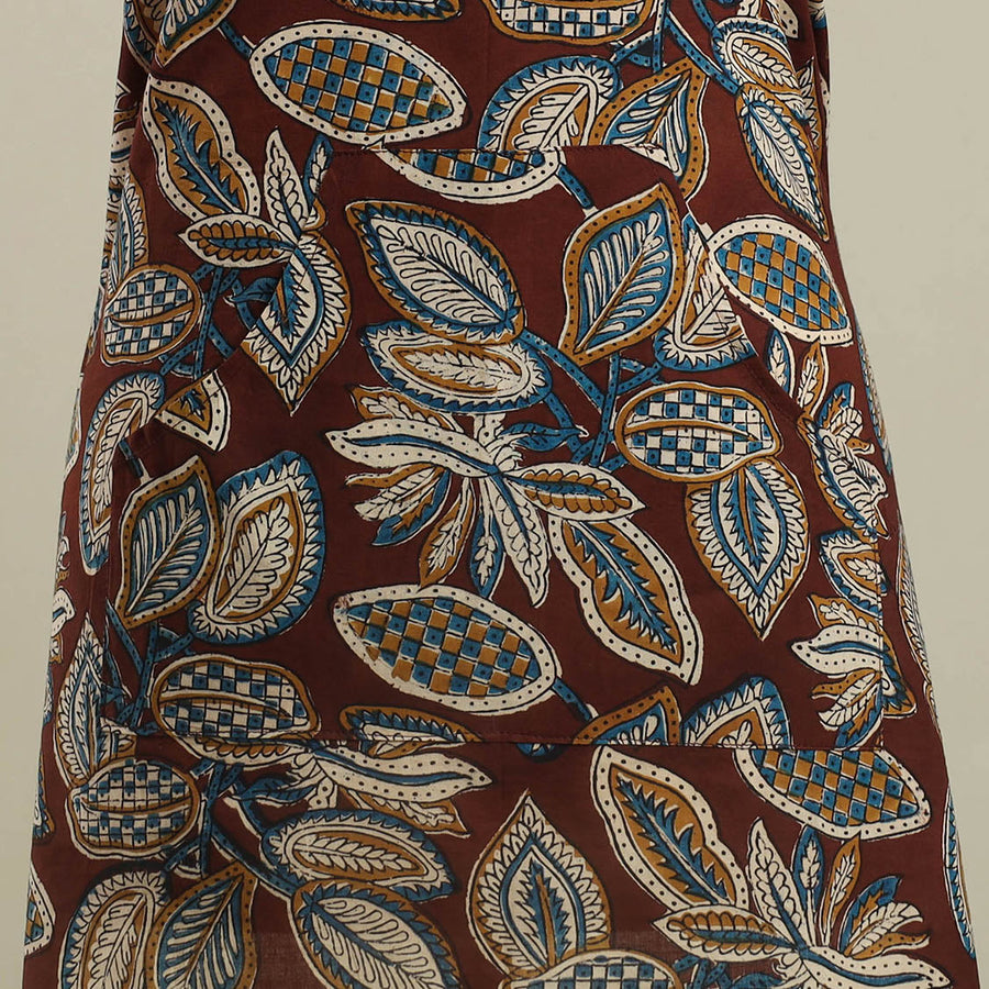 This brown kalamkari block print cotton apron beautifully showcases traditional block printing techniques, featuring intricate patterns that bring a touch of heritage to your daily routine. Designed for both style and practicality, it comes with adjustable straps for a customized fit and a spacious front pocket for added convenience. Whether you're cooking, baking, or grilling, this apron combines comfort, elegance, and cultural charm, making it a perfect addition to your kitchen essentials.