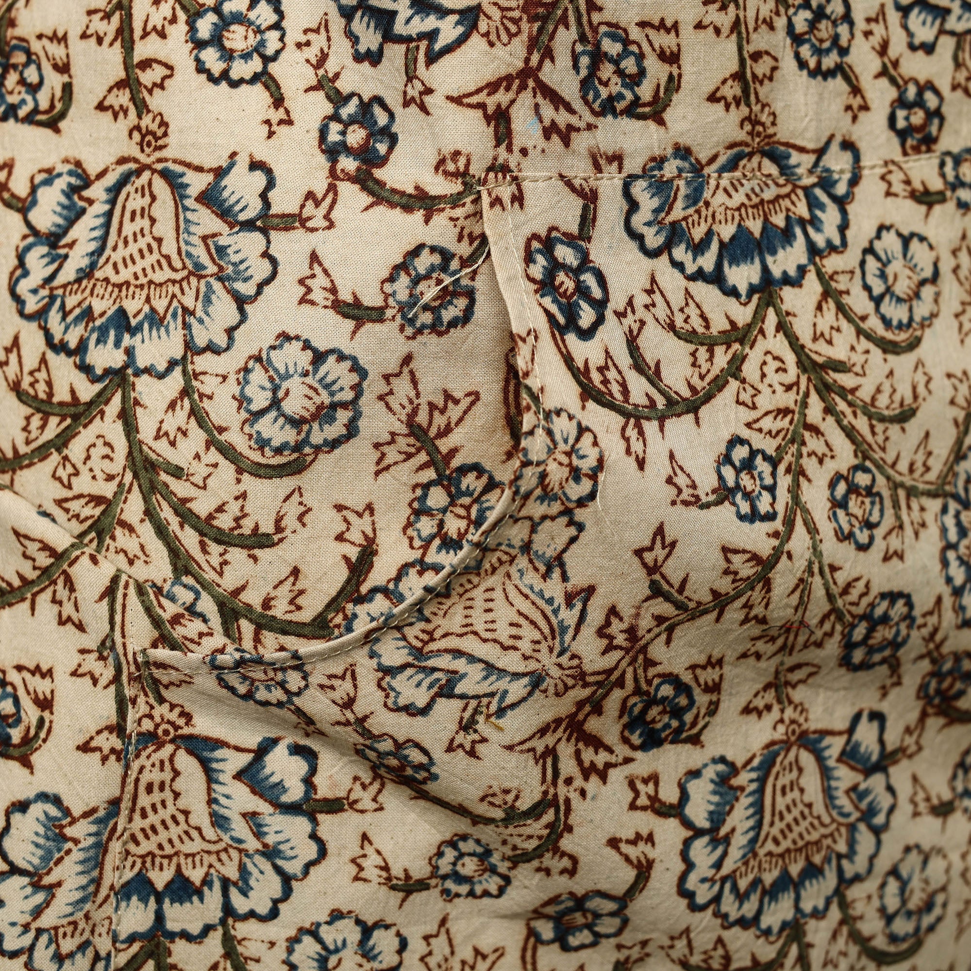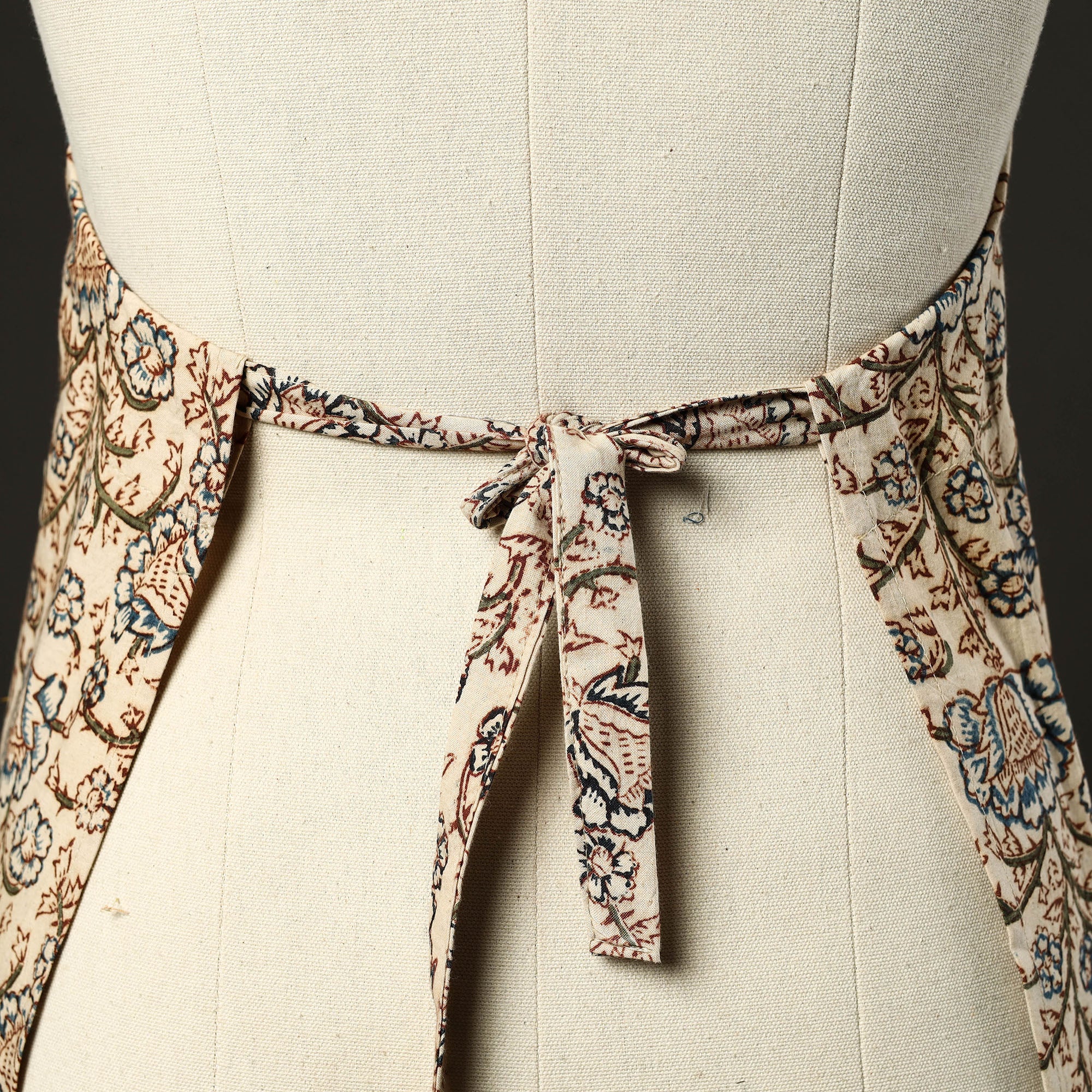 This beige kalamkari print cotton apron with pocket, crafted with traditional kalamkari block printing, combines cultural artistry with everyday functionality. Adorned with kalamkari prints, it features a convenient front pocket and adjustable straps for a comfortable fit. Perfect for cooking, baking, or grilling, this apron adds style and convenience to your kitchen essentials.