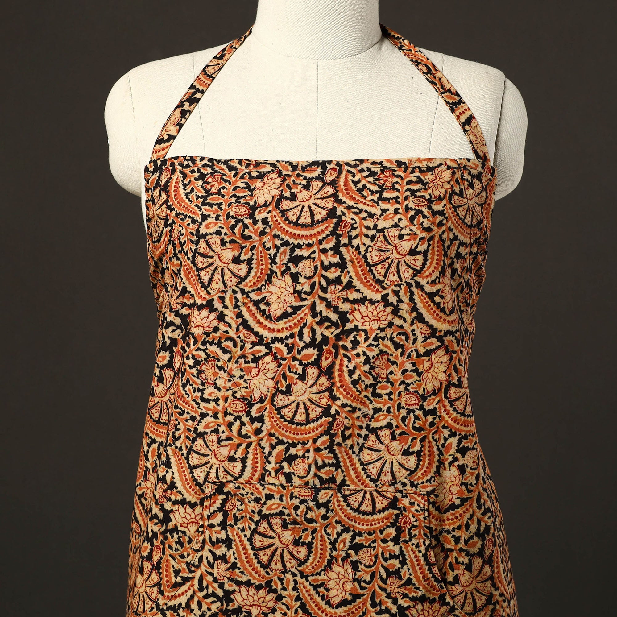This orange kalamkari print cotton apron with pocket, crafted with traditional kalamkari block printing, combines cultural artistry with everyday functionality. Adorned with kalamkari prints, it features a convenient front pocket and adjustable straps for a comfortable fit. Perfect for cooking, baking, or grilling, this apron adds style and convenience to your kitchen essentials.