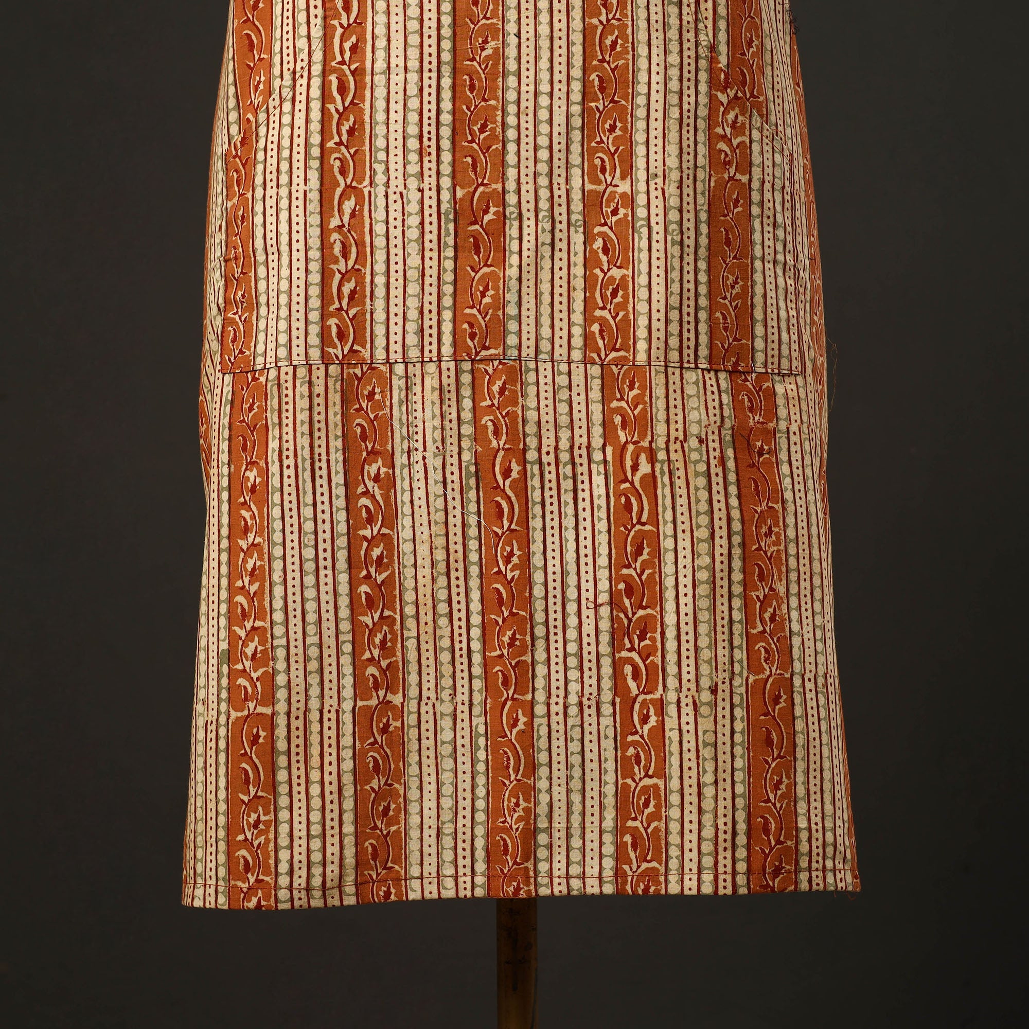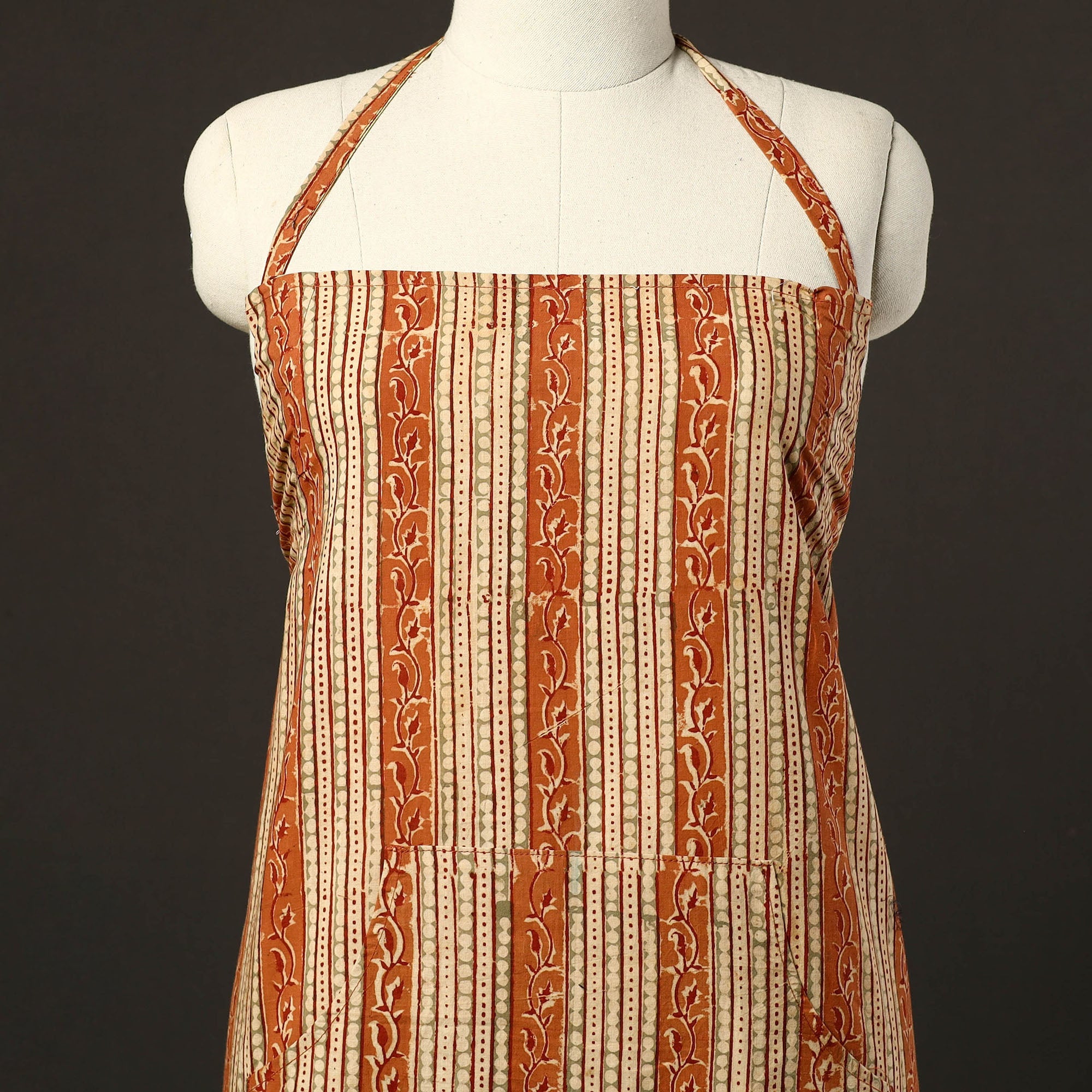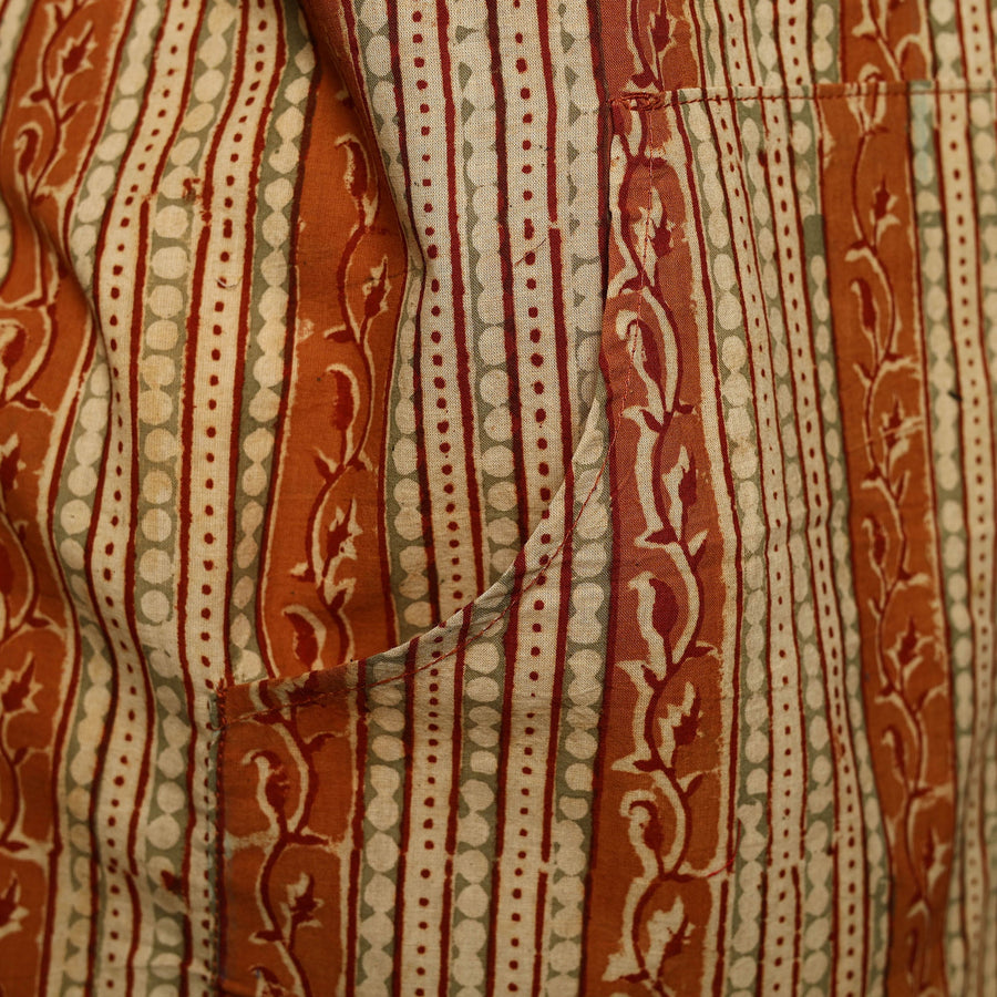 This orange kalamkari print cotton apron with pocket, crafted with traditional kalamkari block printing, combines cultural artistry with everyday functionality. Adorned with kalamkari prints, it features a convenient front pocket and adjustable straps for a comfortable fit. Perfect for cooking, baking, or grilling, this apron adds style and convenience to your kitchen essentials.