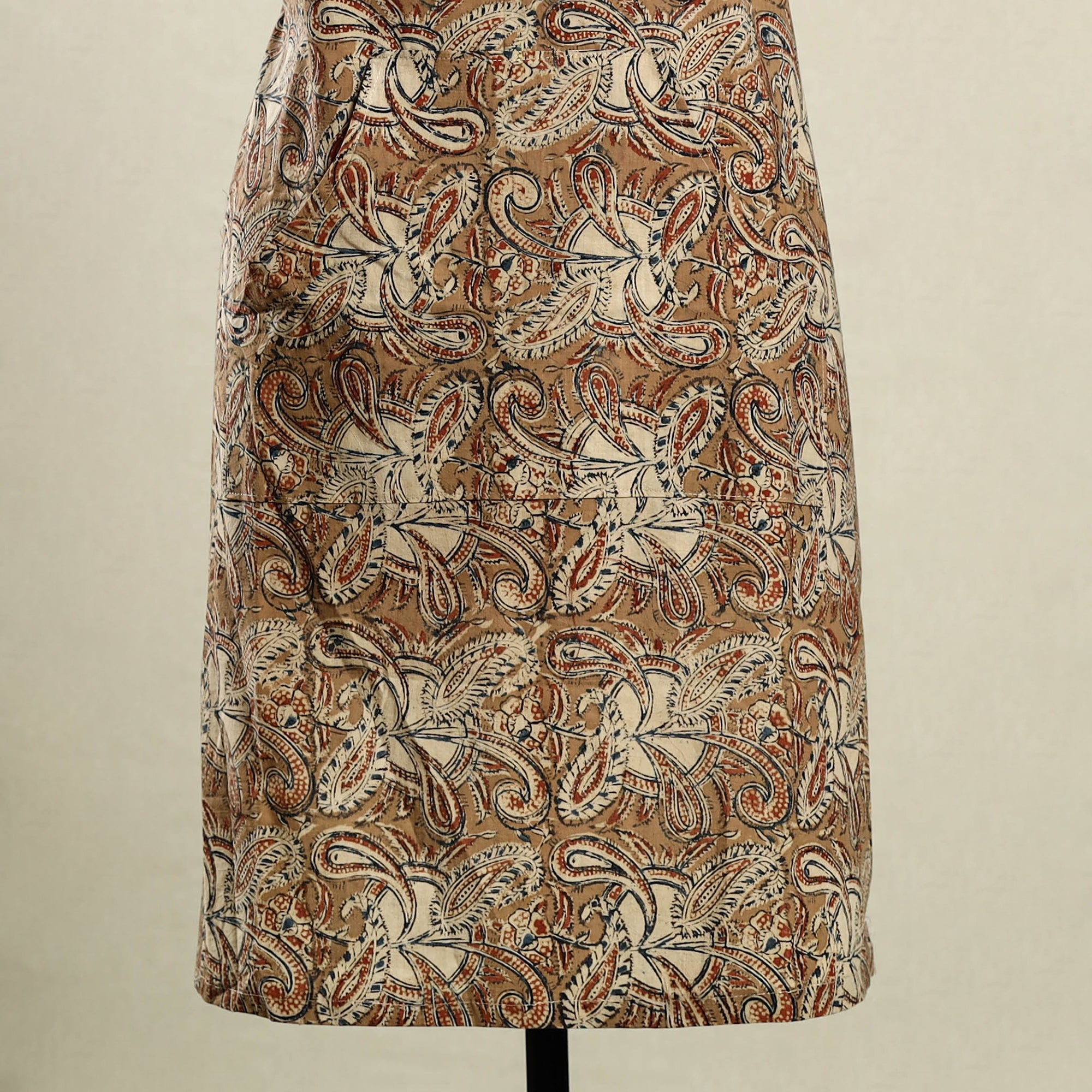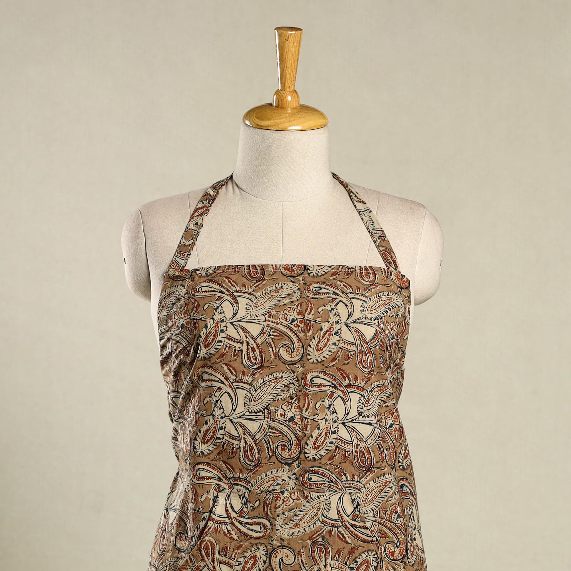 This brown cotton apron features traditional kalamkari block prints, adding a handcrafted touch to your daily kitchen routine. It includes an adjustable neck strap and a spacious front pocket for convenience. The intricate patterns reflect the heritage of Andhra Pradesh’s kalamkari art, practiced by skilled artisans using wooden blocks. Comfortable and practical, it’s great for cooking or baking. It brings a simple, functional style to your kitchen, making everyday tasks feel more special.