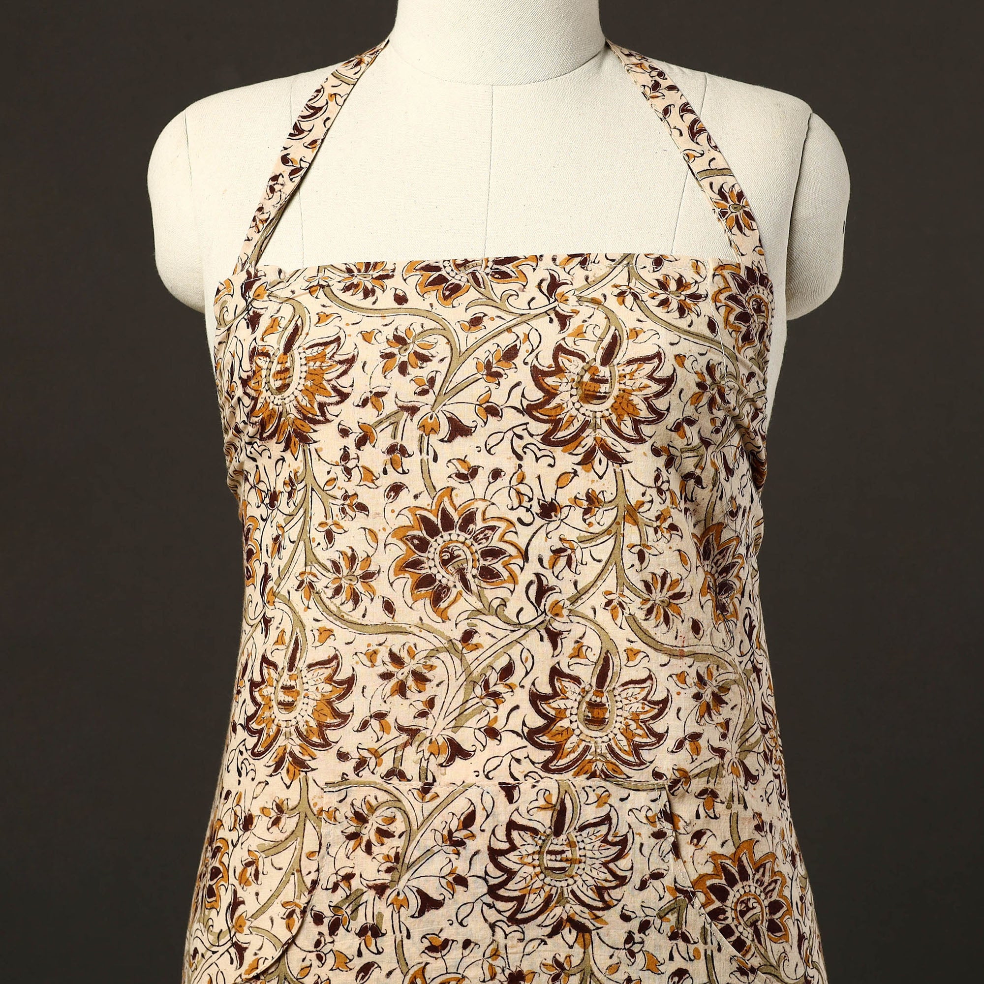 This beige kalamkari print cotton apron with pocket, crafted with traditional kalamkari block printing, combines cultural artistry with everyday functionality. Adorned with kalamkari prints, it features a convenient front pocket and adjustable straps for a comfortable fit. Perfect for cooking, baking, or grilling, this apron adds style and convenience to your kitchen essentials.