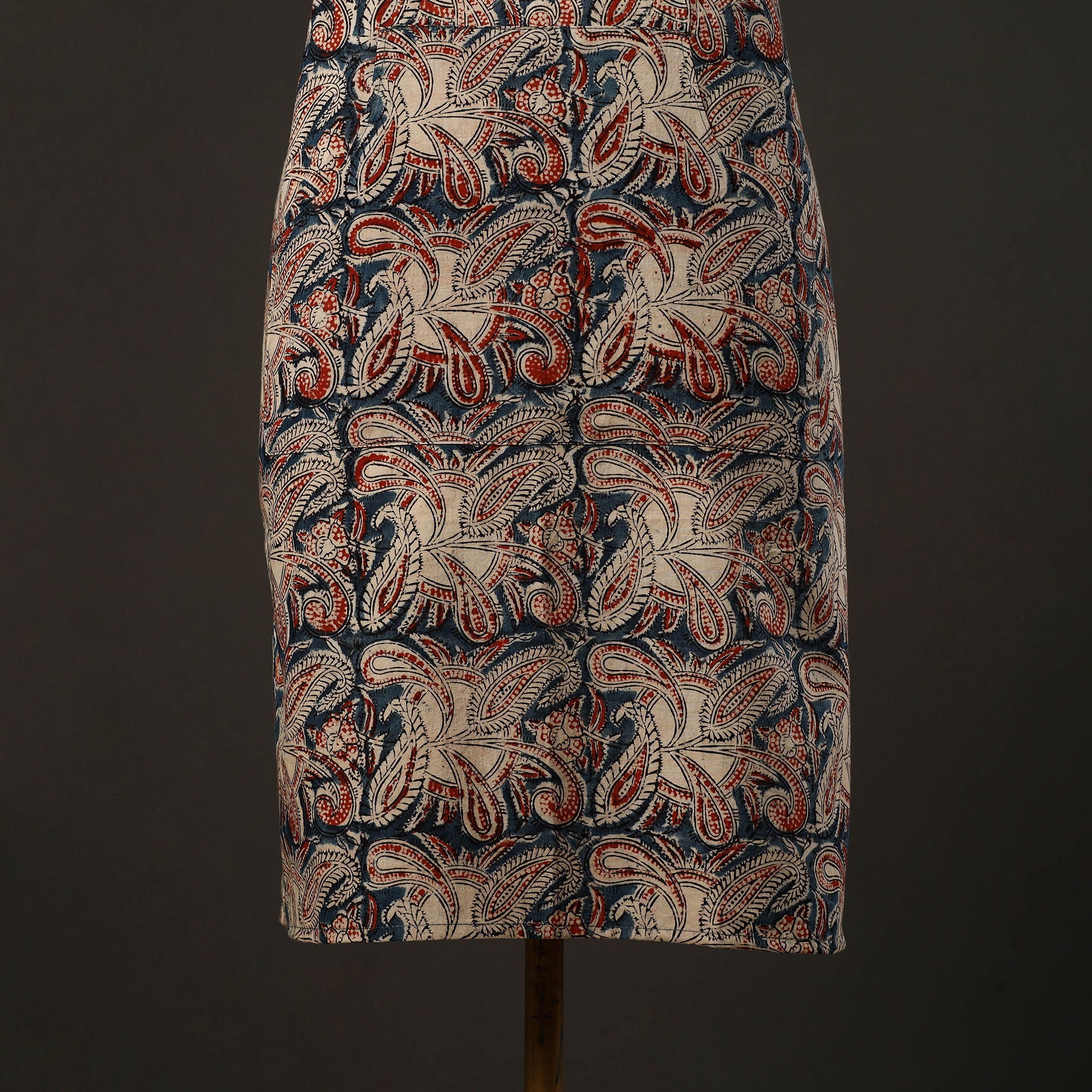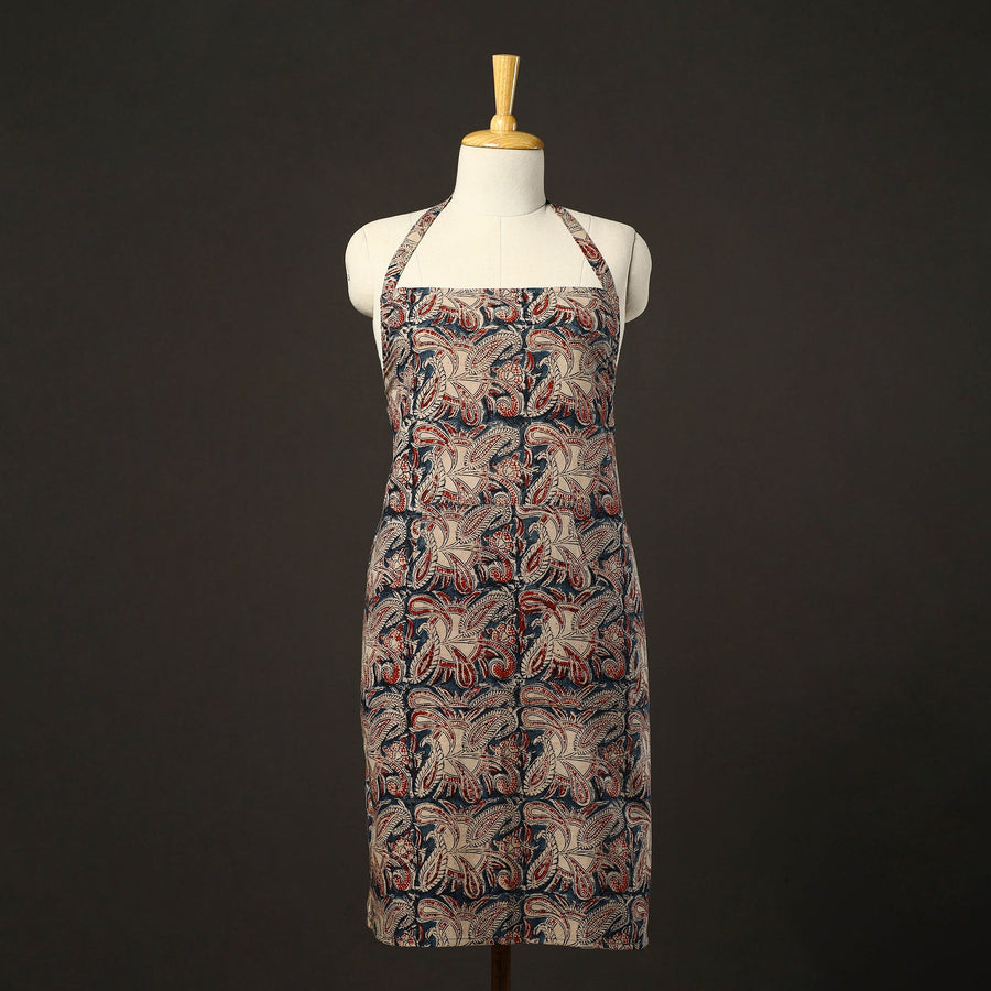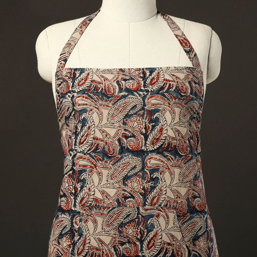 This blue kalamkari print cotton apron with pocket, crafted with traditional kalamkari block printing, combines cultural artistry with everyday functionality. Adorned with kalamkari prints, it features a convenient front pocket and adjustable straps for a comfortable fit. Perfect for cooking, baking, or grilling, this apron adds style and convenience to your kitchen essentials.