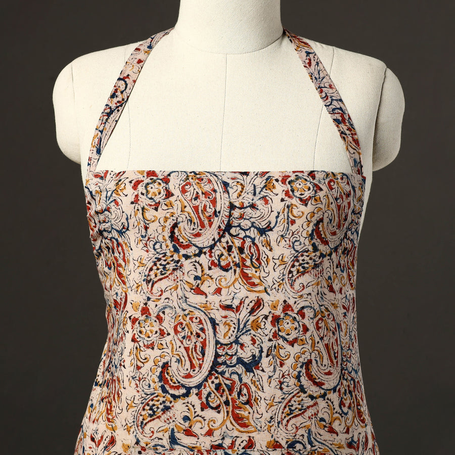 This beige kalamkari print cotton apron with pocket, crafted with traditional kalamkari block printing, combines cultural artistry with everyday functionality. Adorned with kalamkari prints, it features a convenient front pocket and adjustable straps for a comfortable fit. Perfect for cooking, baking, or grilling, this apron adds style and convenience to your kitchen essentials.