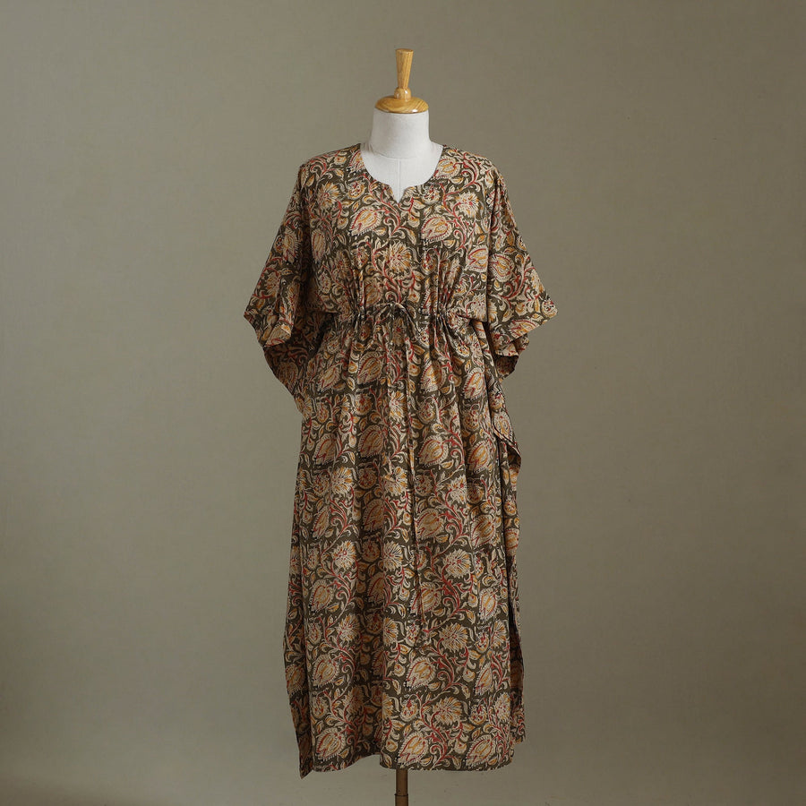Enjoy effortless comfort in our brown kalamkari block print kaftan, crafted from soft and breathable cotton. Featuring timeless motifs in a traditional style, this free-flowing silhouette includes a functional drawstring at the waist for a customizable fit. Whether you're lounging at home or heading out for brunch, this kaftan blends relaxed charm with all-day ease.