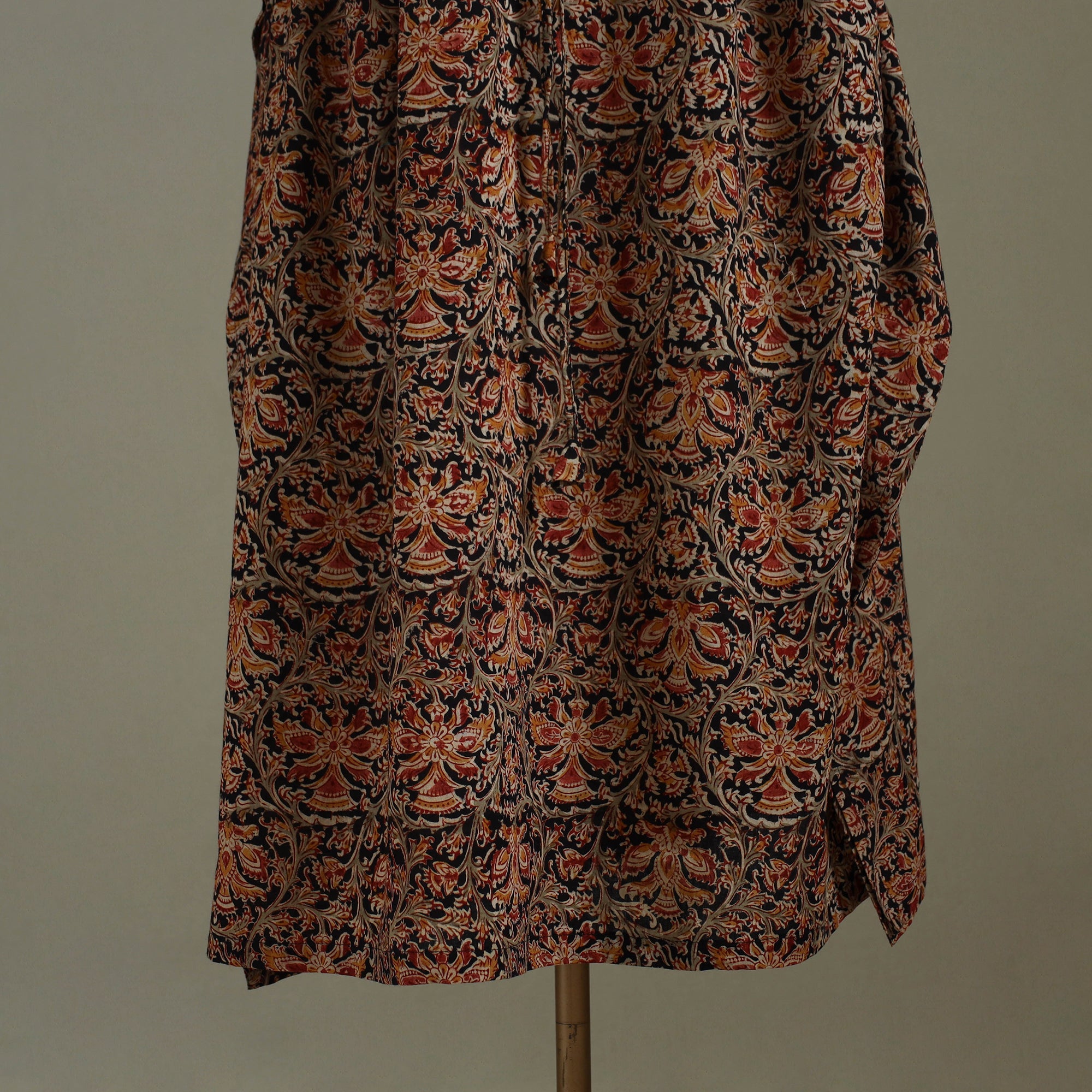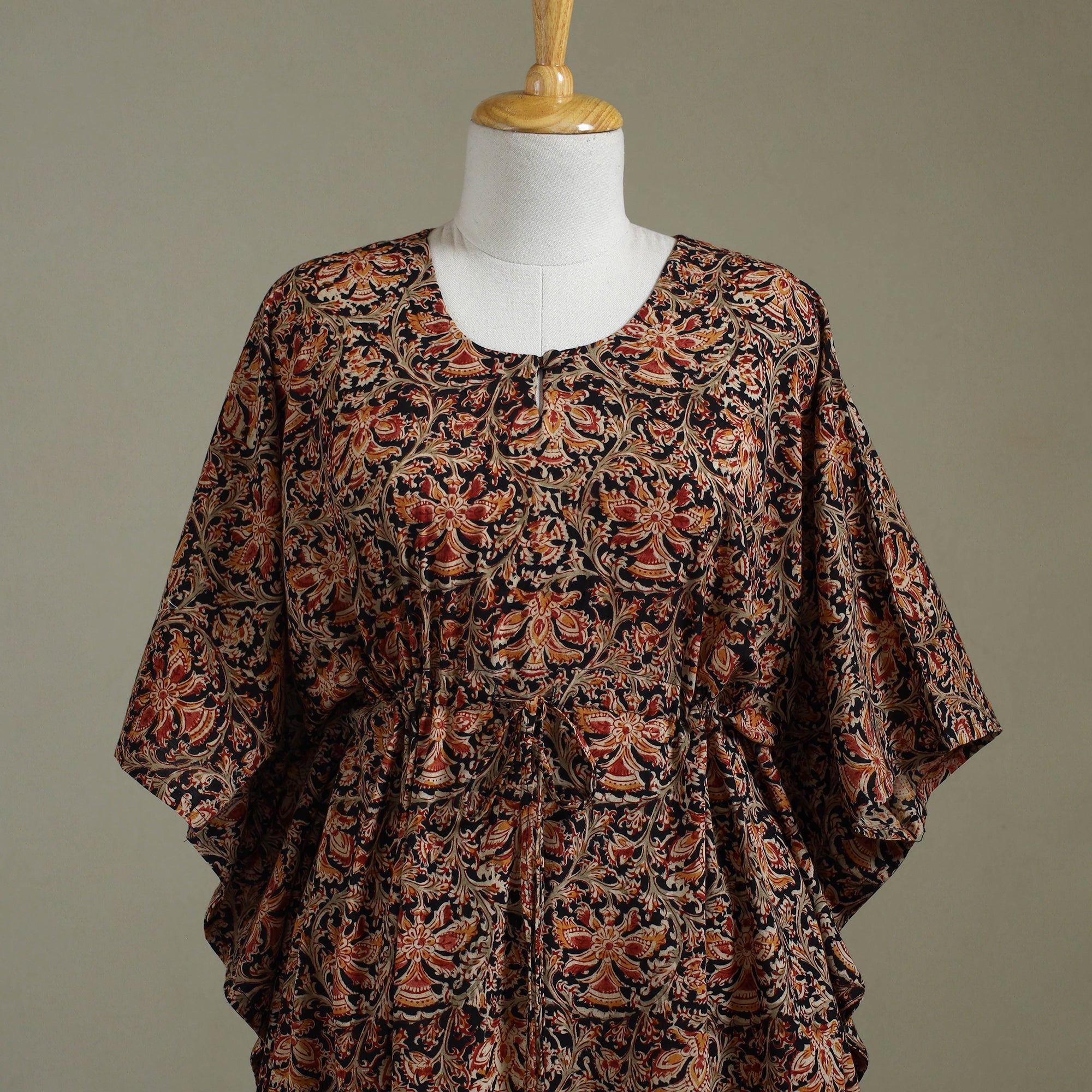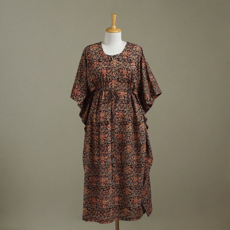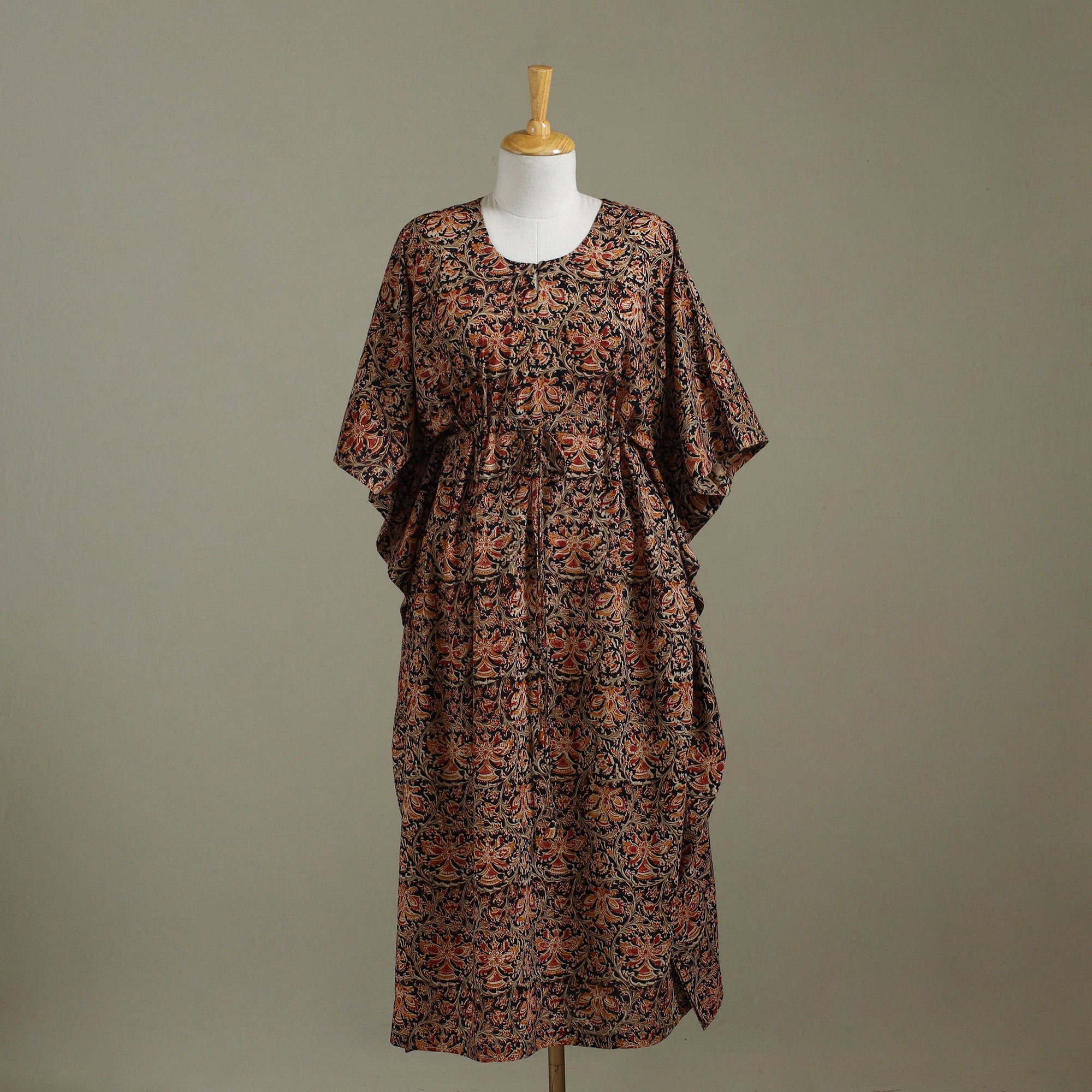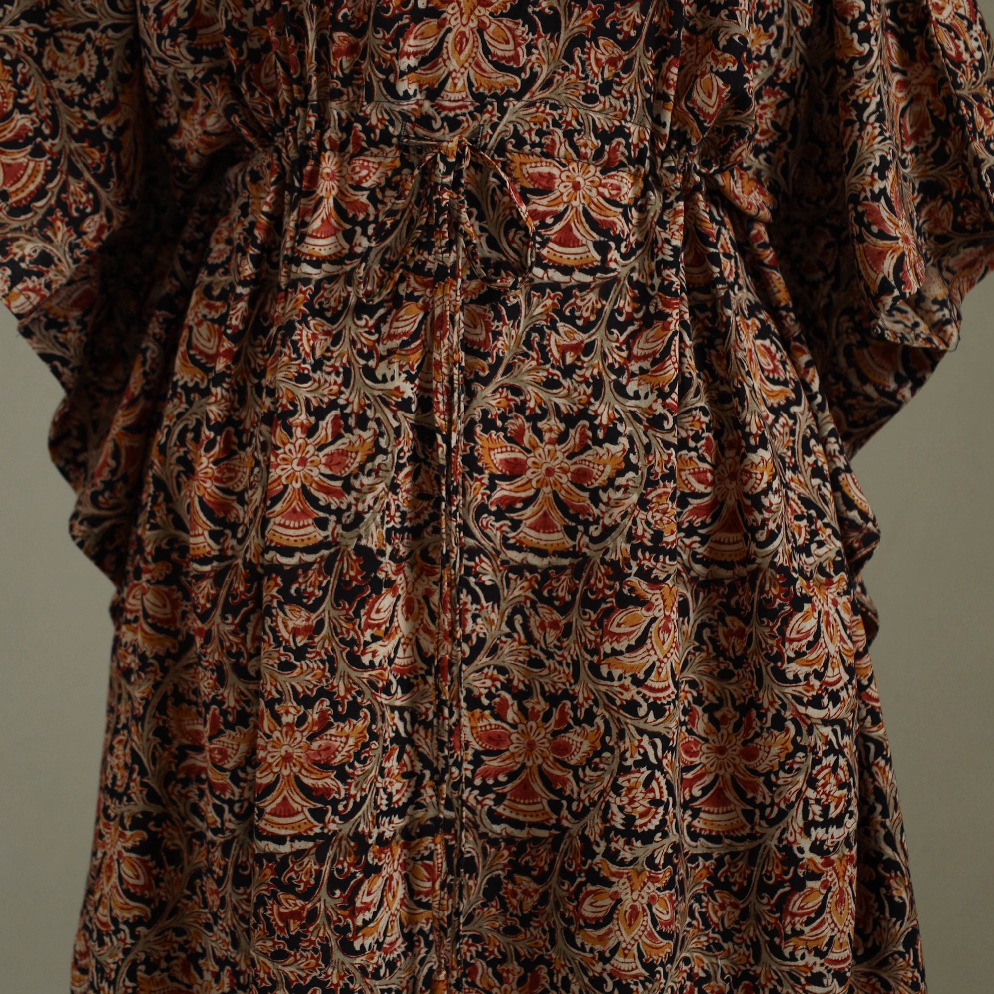 Enjoy effortless comfort in our brown kalamkari block print kaftan, crafted from soft and breathable cotton. Featuring timeless motifs in a traditional style, this free-flowing silhouette includes a functional drawstring at the waist for a customizable fit. Whether you're lounging at home or heading out for brunch, this kaftan blends relaxed charm with all-day ease.