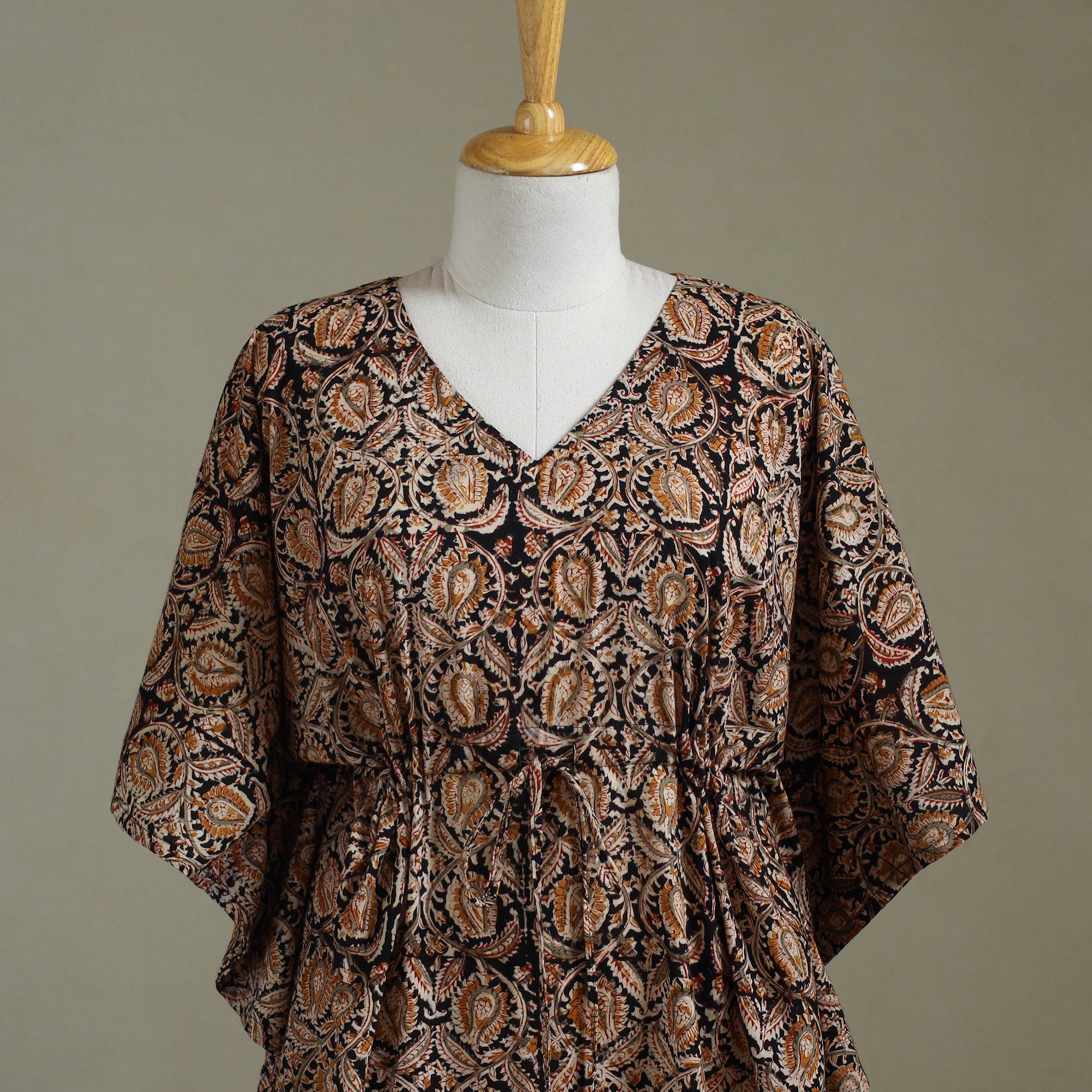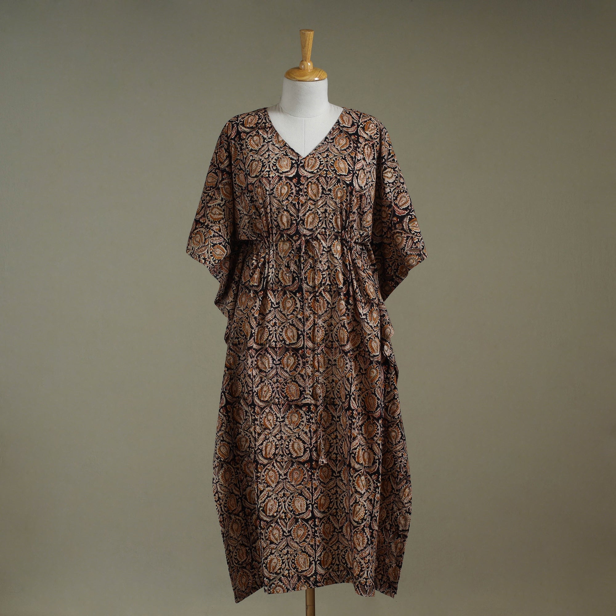 Enjoy effortless comfort in our black kalamkari block print kaftan, crafted from soft and breathable cotton. Featuring timeless motifs in a traditional style, this free-flowing silhouette includes a functional drawstring at the waist for a customizable fit. Whether you're lounging at home or heading out for brunch, this kaftan blends relaxed charm with all-day ease.