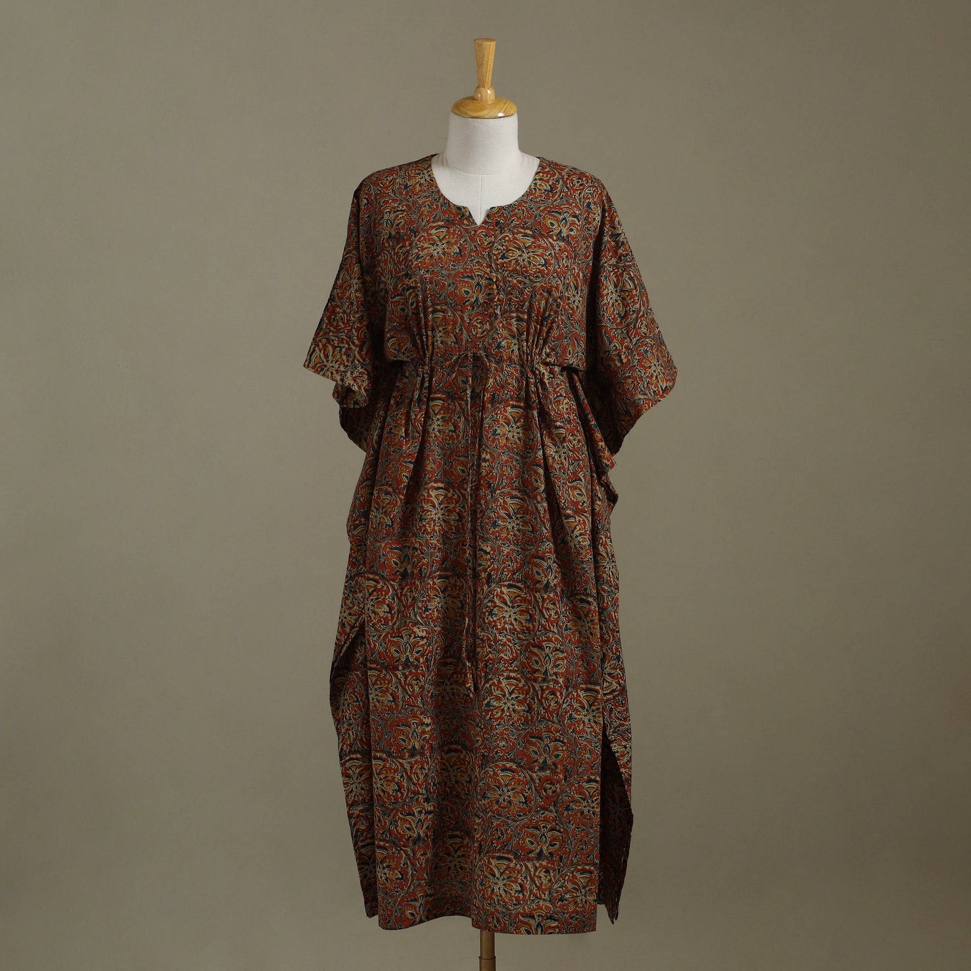 Enjoy effortless comfort in our brown kalamkari block print kaftan, crafted from soft and breathable cotton. Featuring timeless motifs in a traditional style, this free-flowing silhouette includes a functional drawstring at the waist for a customizable fit. Whether you're lounging at home or heading out for brunch, this kaftan blends relaxed charm with all-day ease.
