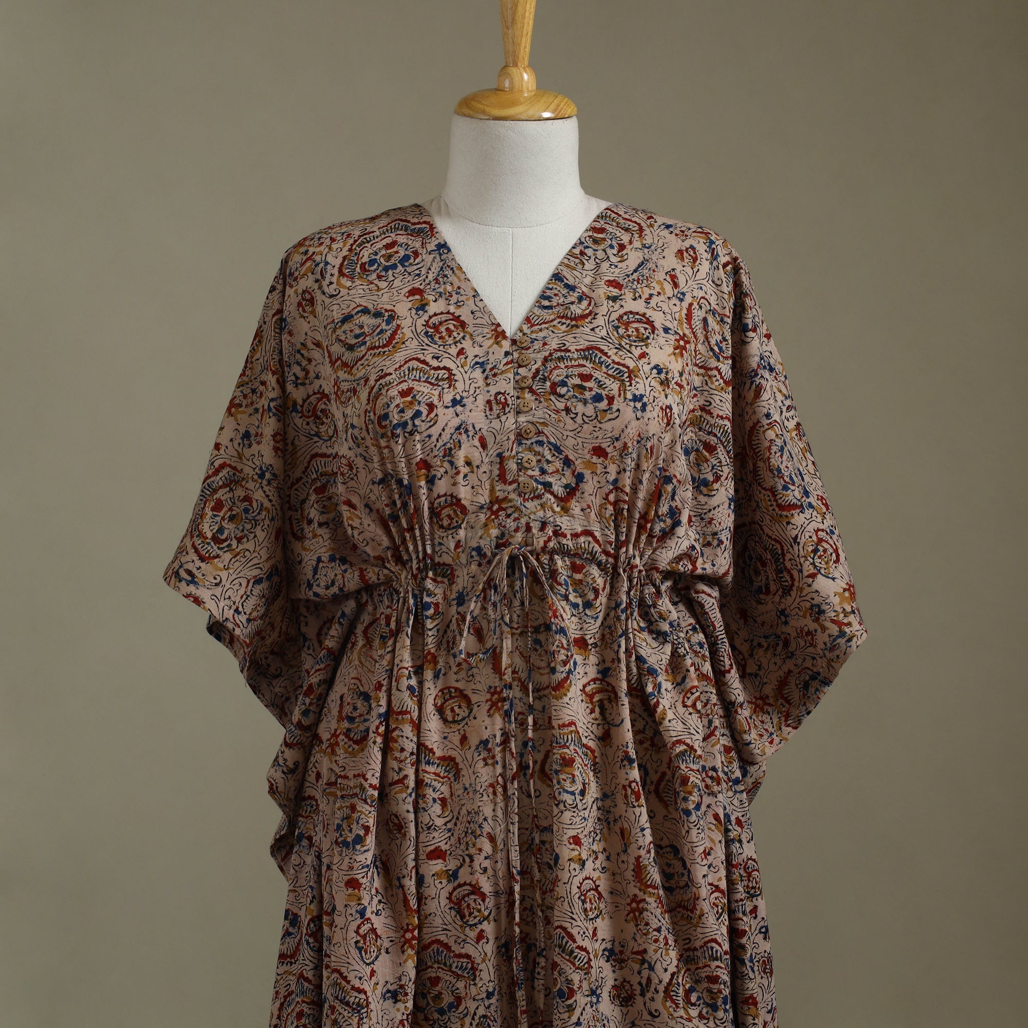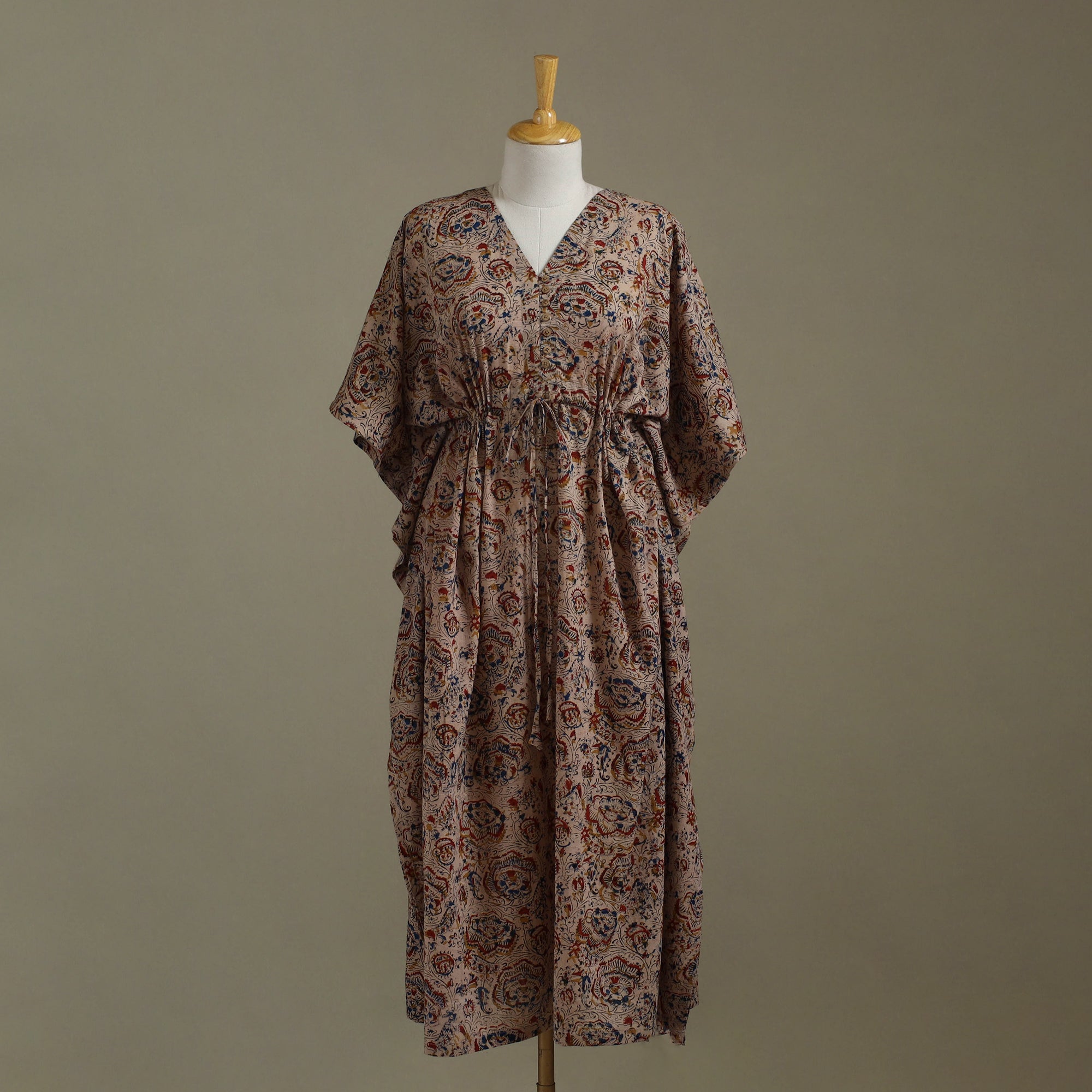 Enjoy effortless comfort in our brown kalamkari block print kaftan, crafted from soft and breathable cotton. Featuring timeless motifs in a traditional style, this free-flowing silhouette includes a functional drawstring at the waist for a customizable fit. Whether you're lounging at home or heading out for brunch, this kaftan blends relaxed charm with all-day ease.