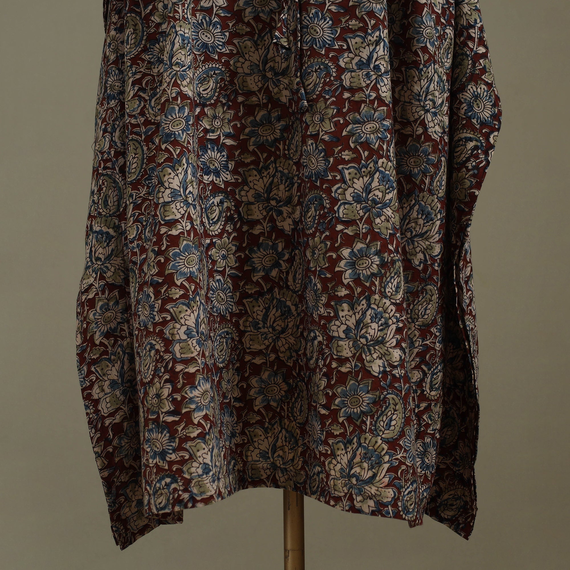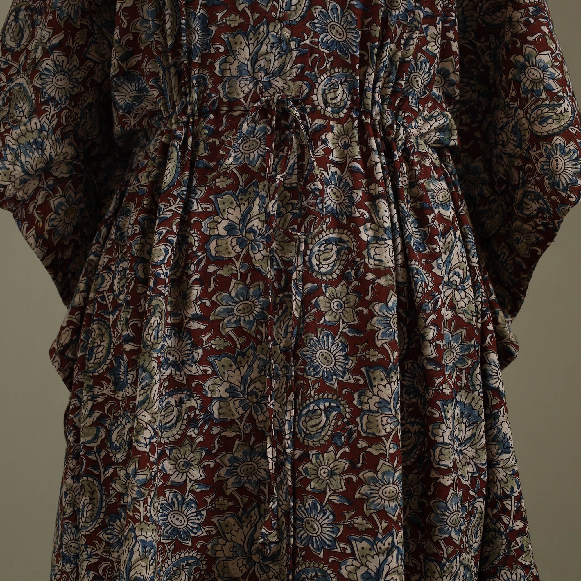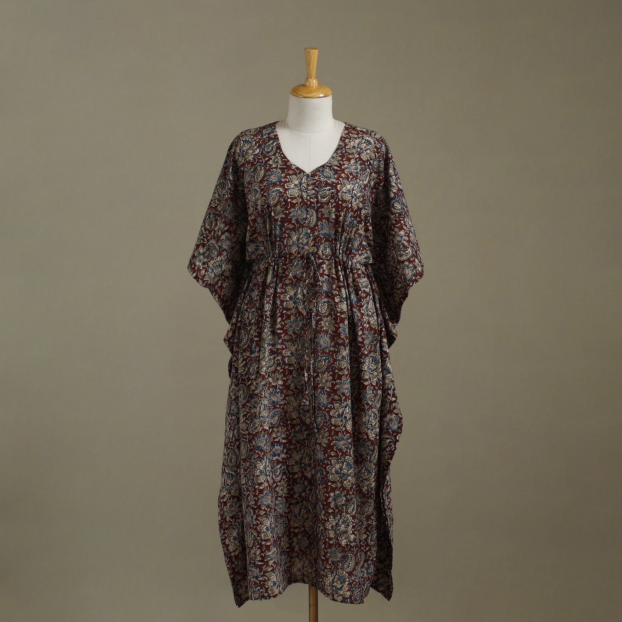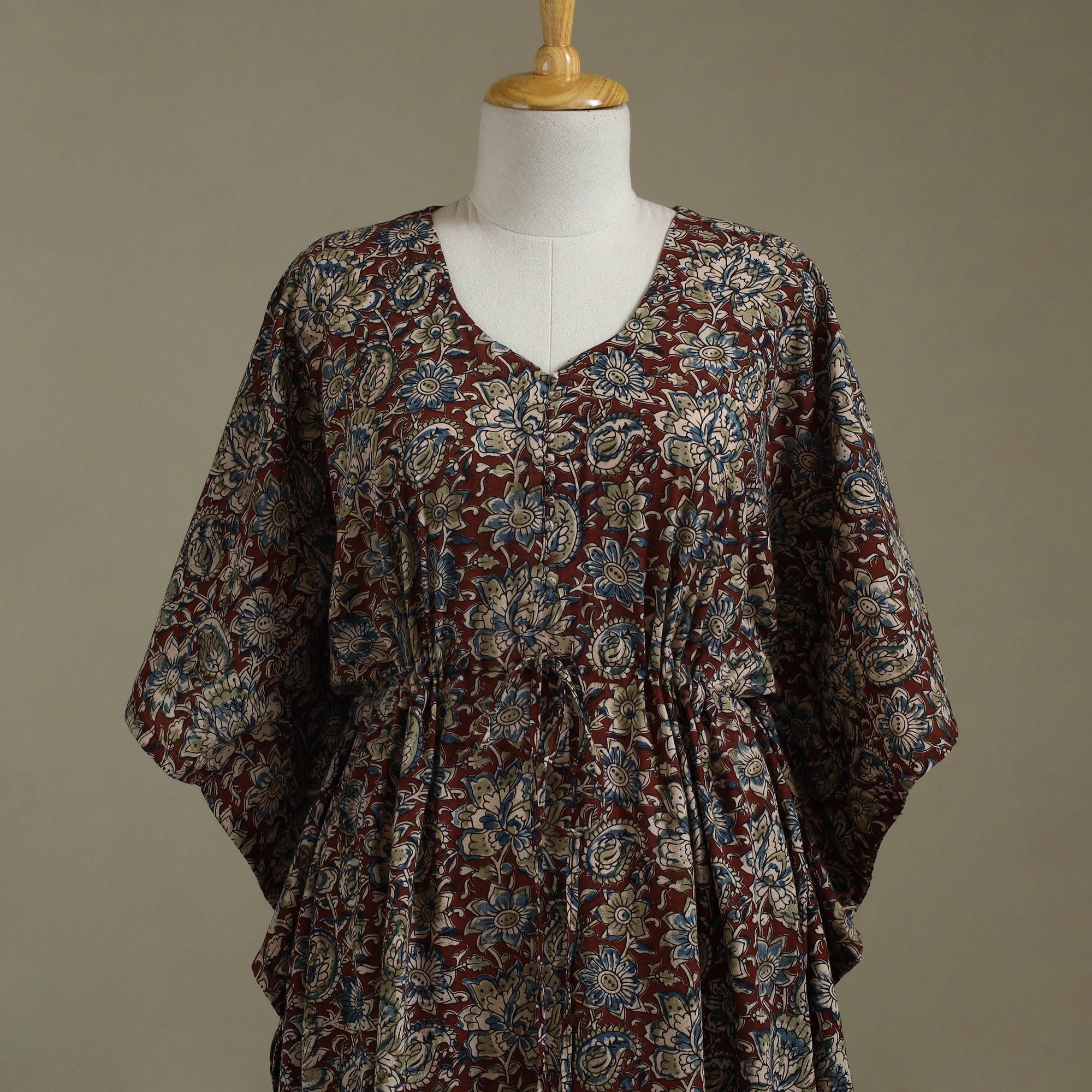 Enjoy effortless comfort in our brown kalamkari block print kaftan, crafted from soft and breathable cotton. Featuring timeless motifs in a traditional style, this free-flowing silhouette includes a functional drawstring at the waist for a customizable fit. Whether you're lounging at home or heading out for brunch, this kaftan blends relaxed charm with all-day ease.