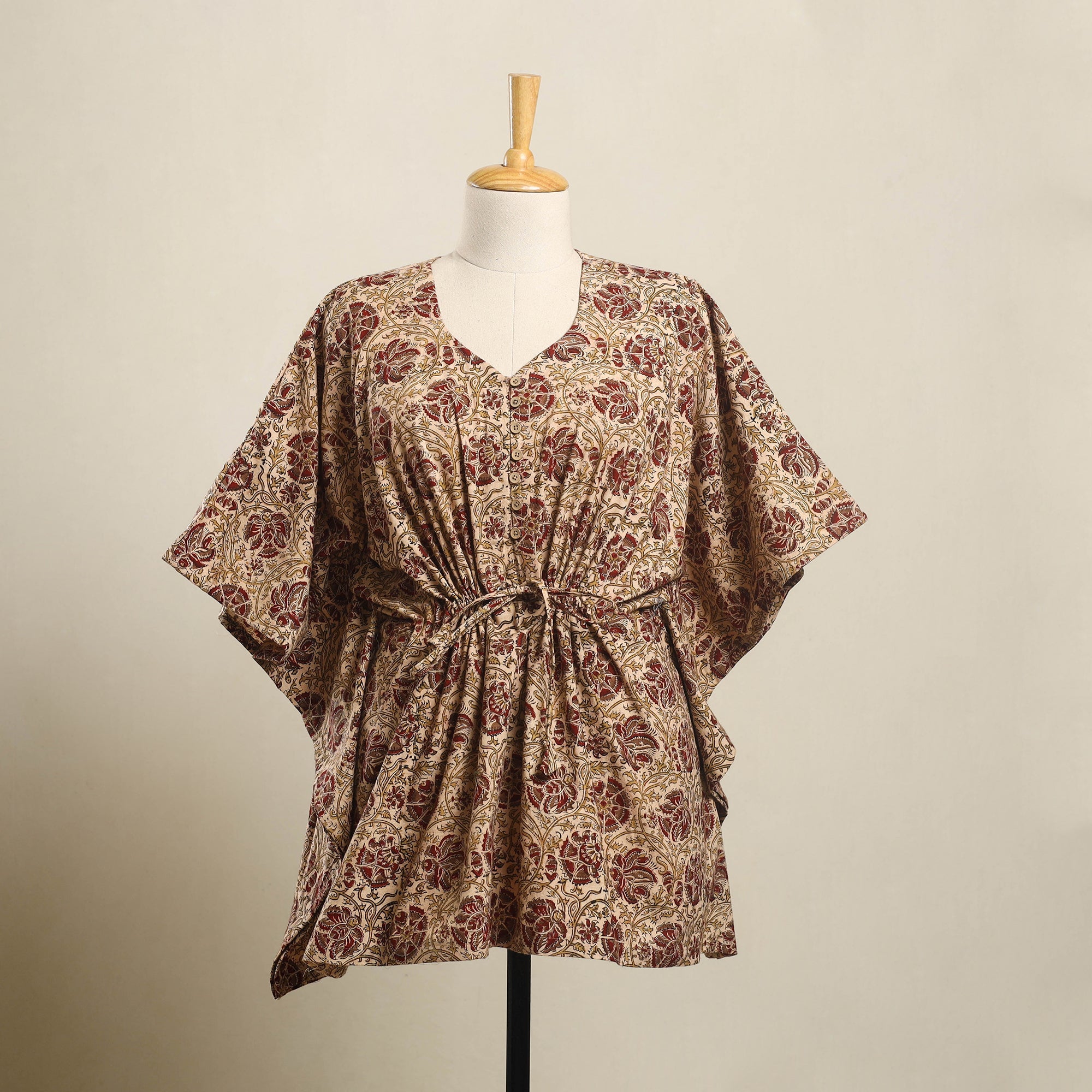Experience effortless elegance with this beautifully crafted kalamkari block print cotton kaftan. The breathable cotton fabric keeps you cool, while its relaxed silhouette, flowy sleeves, and adjustable drawstring waist add a touch of effortless grace. Whether you’re lounging at home or strolling on the beach, this kaftan is your go to for comfort and style.