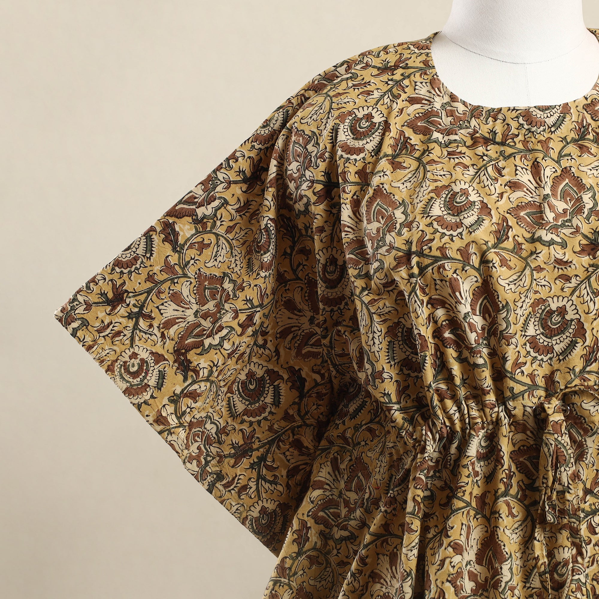 Experience the perfect blend of tradition and comfort with this yellow kalamkari block print cotton kaftan, designed for effortless style. Made from breathable cotton, the kaftan drapes gracefully with its relaxed fit, and the adjustable drawstring waist ensures a custom fit making it ideal for lounging, vacations, or casual day outs.