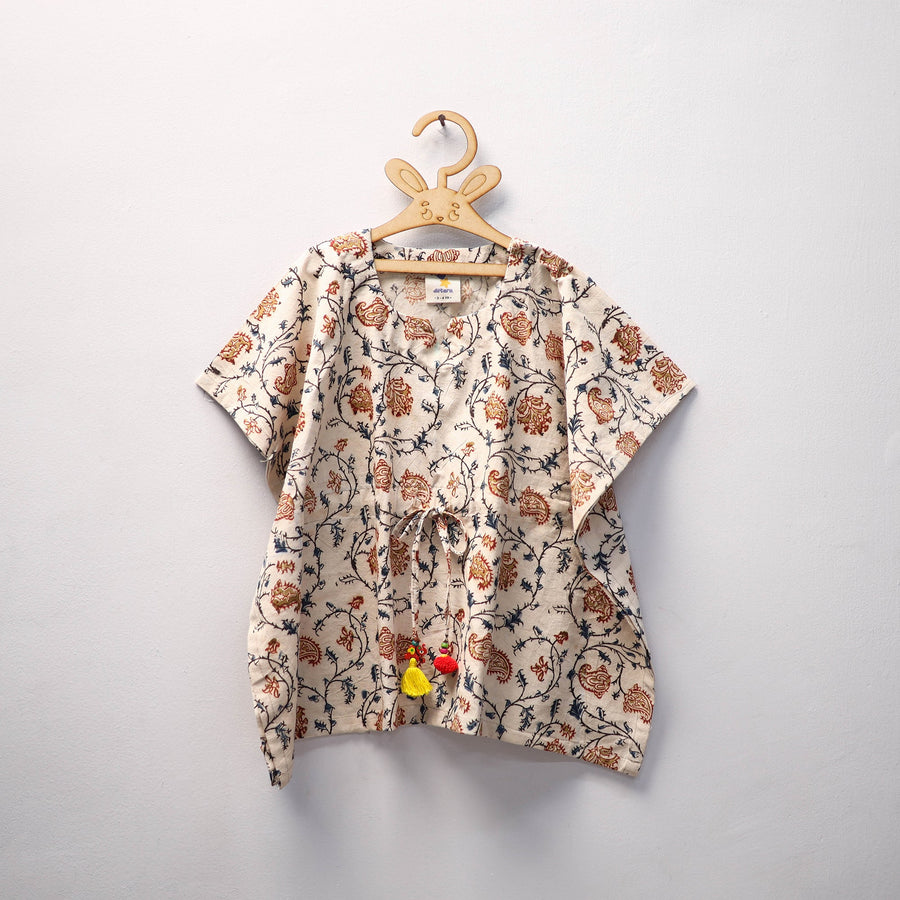 Discover our delightful collection of beige kalamkari block-printed cotton kaftans for kids, crafted to blend comfort, style, and a touch of tradition in your child’s wardrobe. Made from soft, breathable cotton, these kaftans are lightweight and gentle on the skin, ensuring all-day comfort. Featuring a relaxed fit and an adjustable drawstring adorned with tassels, they offer ease of movement and a flexible fit that grows with your little one.