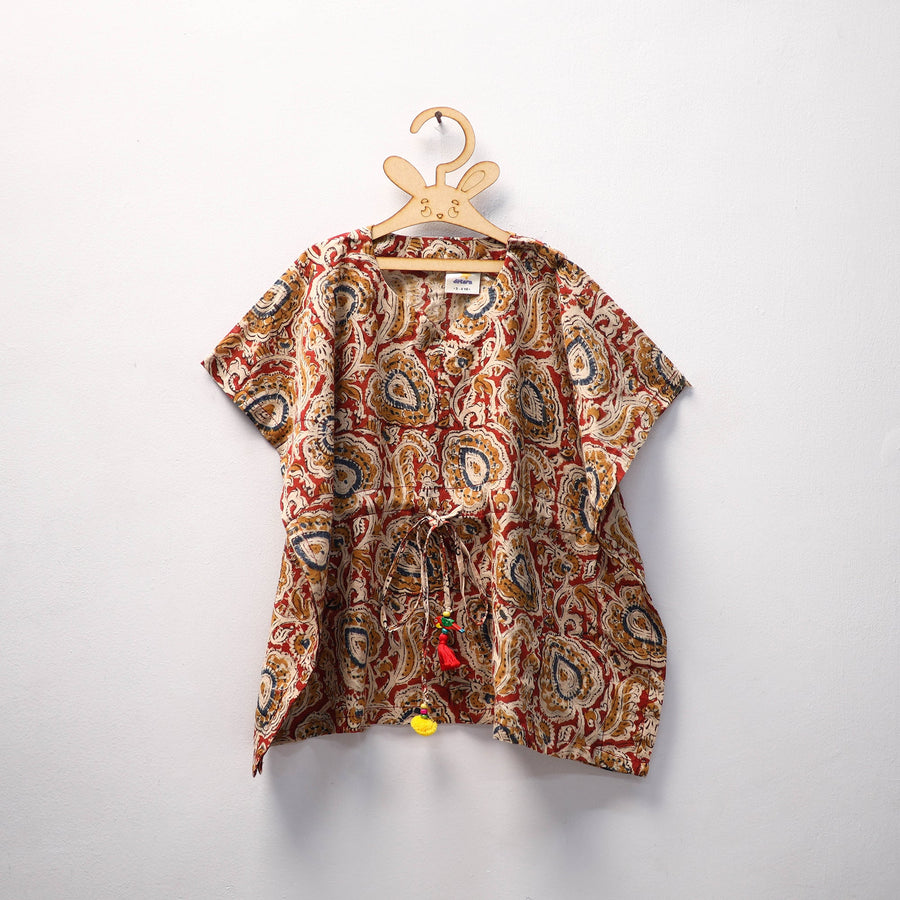 Discover our delightful collection of red kalamkari block-printed cotton kaftans for kids, crafted to blend comfort, style, and a touch of tradition in your child’s wardrobe. Made from soft, breathable cotton, these kaftans are lightweight and gentle on the skin, ensuring all-day comfort. Featuring a relaxed fit and an adjustable drawstring adorned with tassels, they offer ease of movement and a flexible fit that grows with your little one.