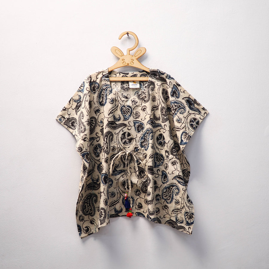 Discover our delightful collection of beige kalamkari block-printed cotton kaftans for kids, crafted to blend comfort, style, and a touch of tradition in your child’s wardrobe. Made from soft, breathable cotton, these kaftans are lightweight and gentle on the skin, ensuring all-day comfort. Featuring a relaxed fit and an adjustable drawstring adorned with tassels, they offer ease of movement and a flexible fit that grows with your little one.