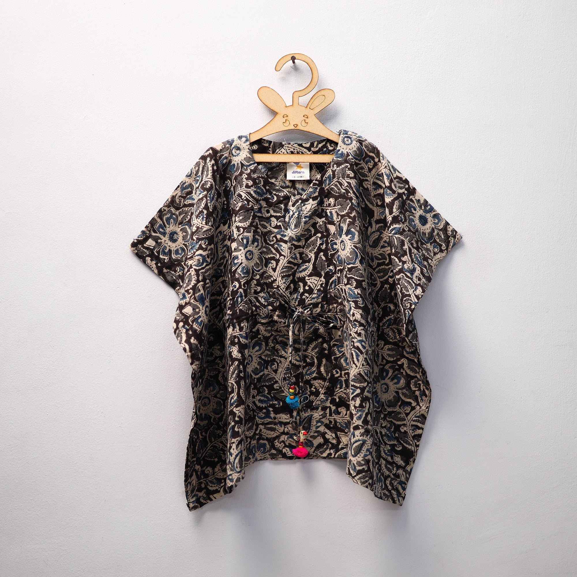 Discover our delightful collection of black kalamkari block-printed cotton kaftans for kids, crafted to blend comfort, style, and a touch of tradition in your child’s wardrobe. Made from soft, breathable cotton, these kaftans are lightweight and gentle on the skin, ensuring all-day comfort. Featuring a relaxed fit and an adjustable drawstring adorned with tassels, they offer ease of movement and a flexible fit that grows with your little one.