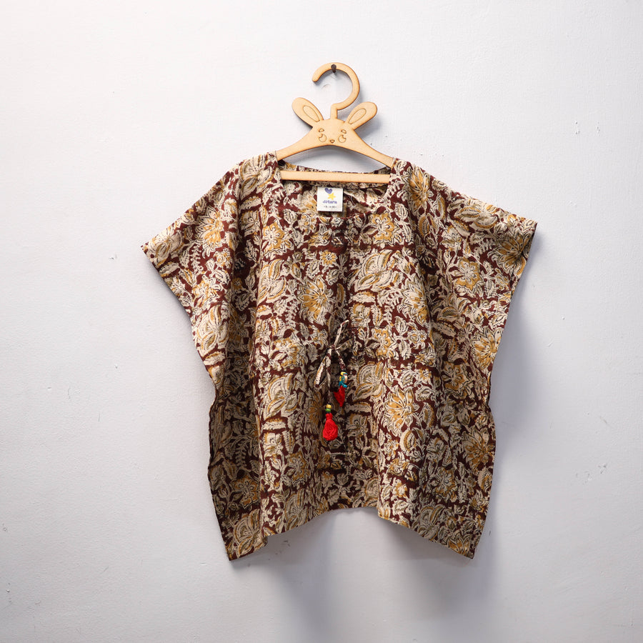 Discover our delightful collection of brown kalamkari block-printed cotton kaftans for kids, crafted to blend comfort, style, and a touch of tradition in your child’s wardrobe. Made from soft, breathable cotton, these kaftans are lightweight and gentle on the skin, ensuring all-day comfort. Featuring a relaxed fit and an adjustable drawstring adorned with tassels, they offer ease of movement and a flexible fit that grows with your little one.
