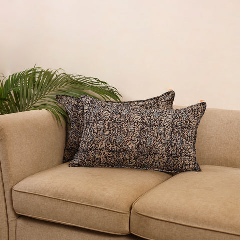 Black kalamkari pillow covers (set of 2) crafted from cotton. These covers feature traditional kalamkari block printing, created using hand-carved wooden blocks that bring storytelling patterns. Kalamkari printing originates from Andhra Pradesh and is known as one of the oldest textile techniques. Perfect for elevating the look of your bedroom.