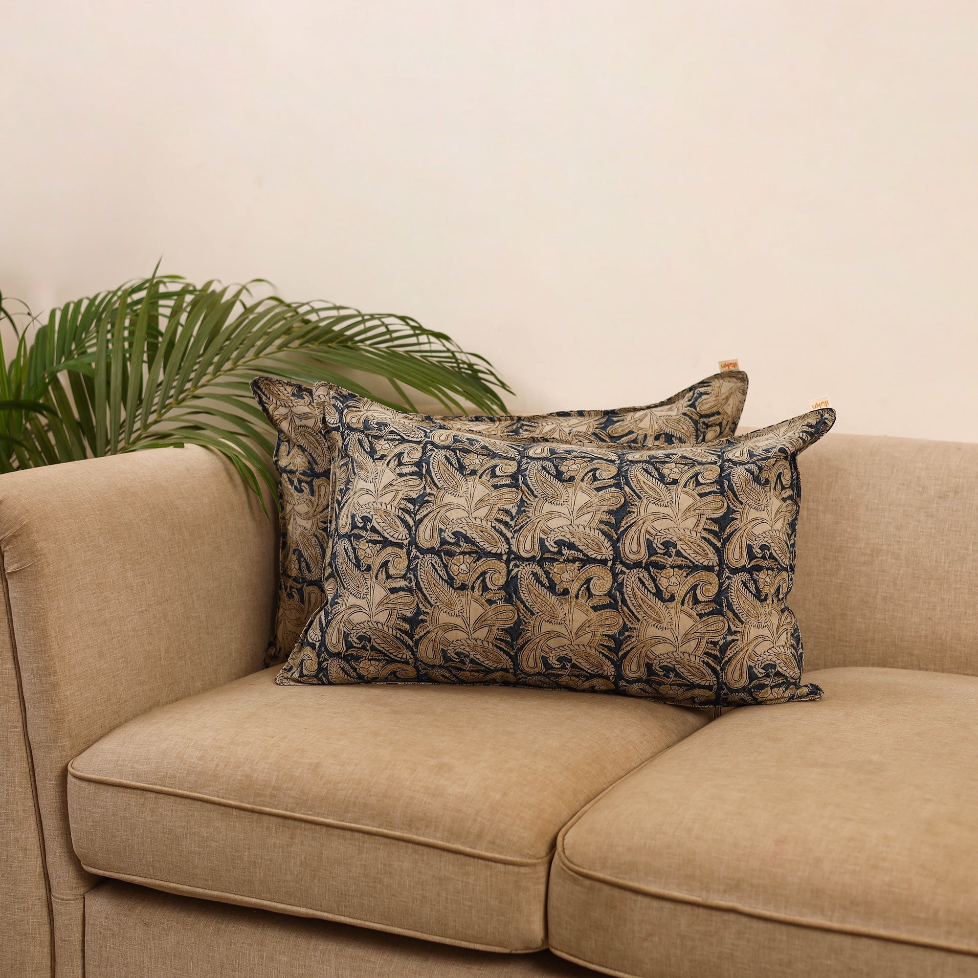 Blue kalamkari pillow covers (set of 2) crafted from cotton. These covers feature traditional kalamkari block printing, created using hand-carved wooden blocks that bring storytelling patterns. Kalamkari printing originates from Andhra Pradesh and is known as one of the oldest textile techniques. Perfect for elevating the look of your bedroom.