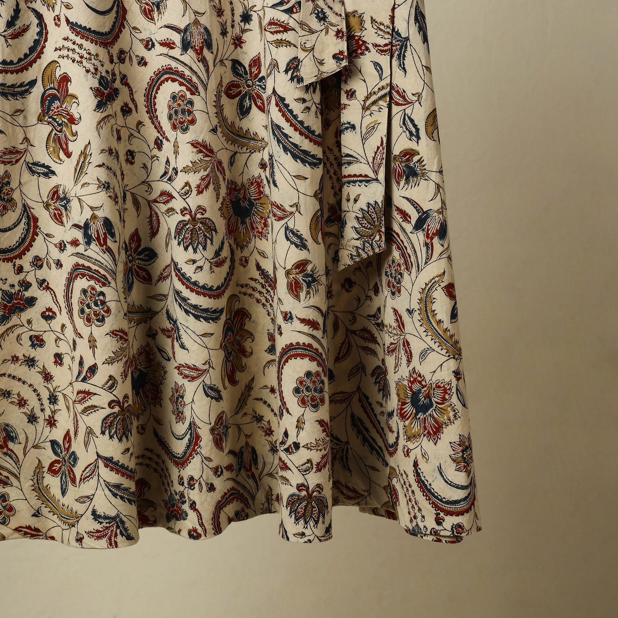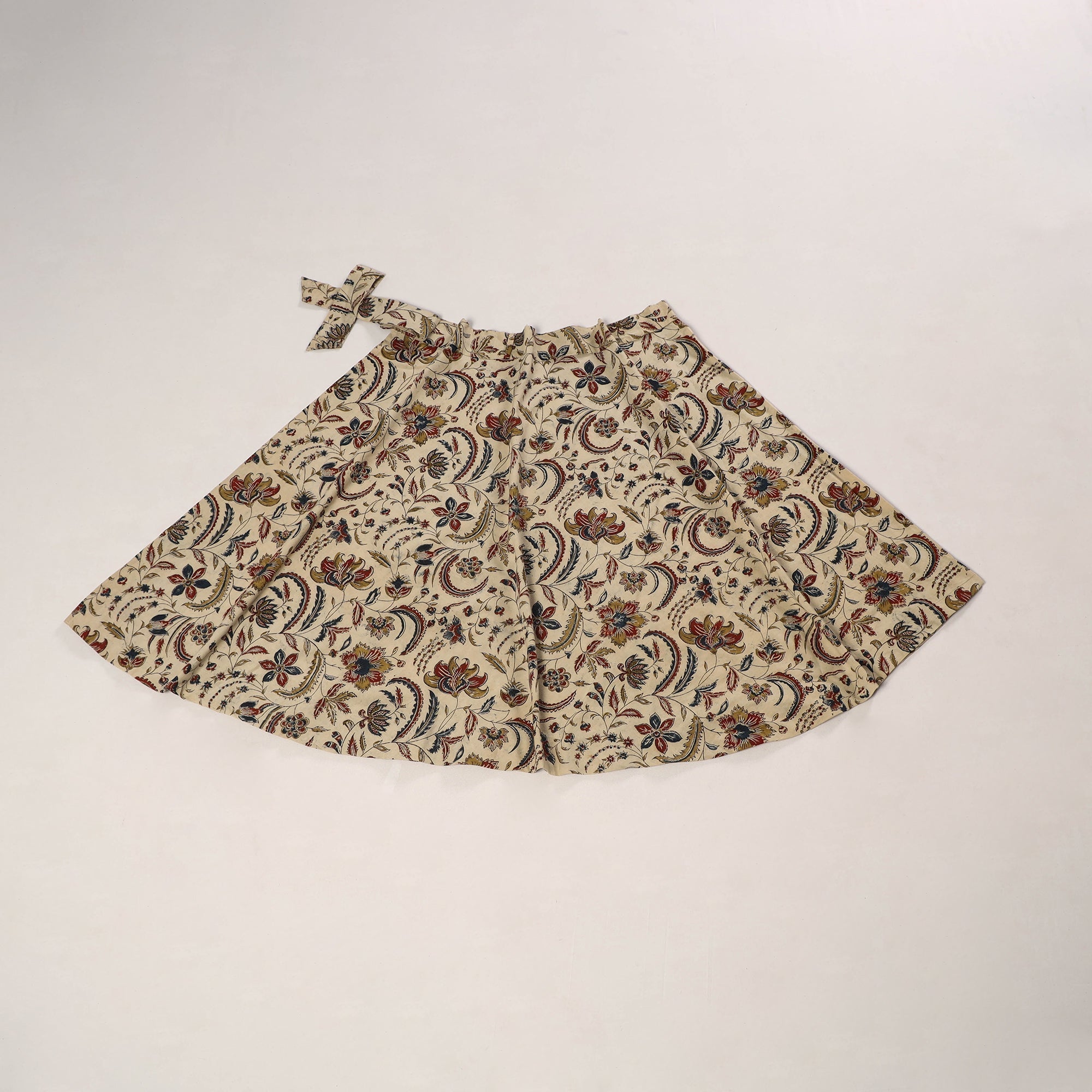 | Material | Add charm to your wardrobe with this beige kalamkari block print cotton wrap-around skirt. Designed with a tie-up waist closure, it combines everyday comfort with ethnic grace. Showcasing hand block-printed motifs inspired by traditional kalamkari art, this skirt is perfect for daily wear, vacations, or relaxed festive styling. |
