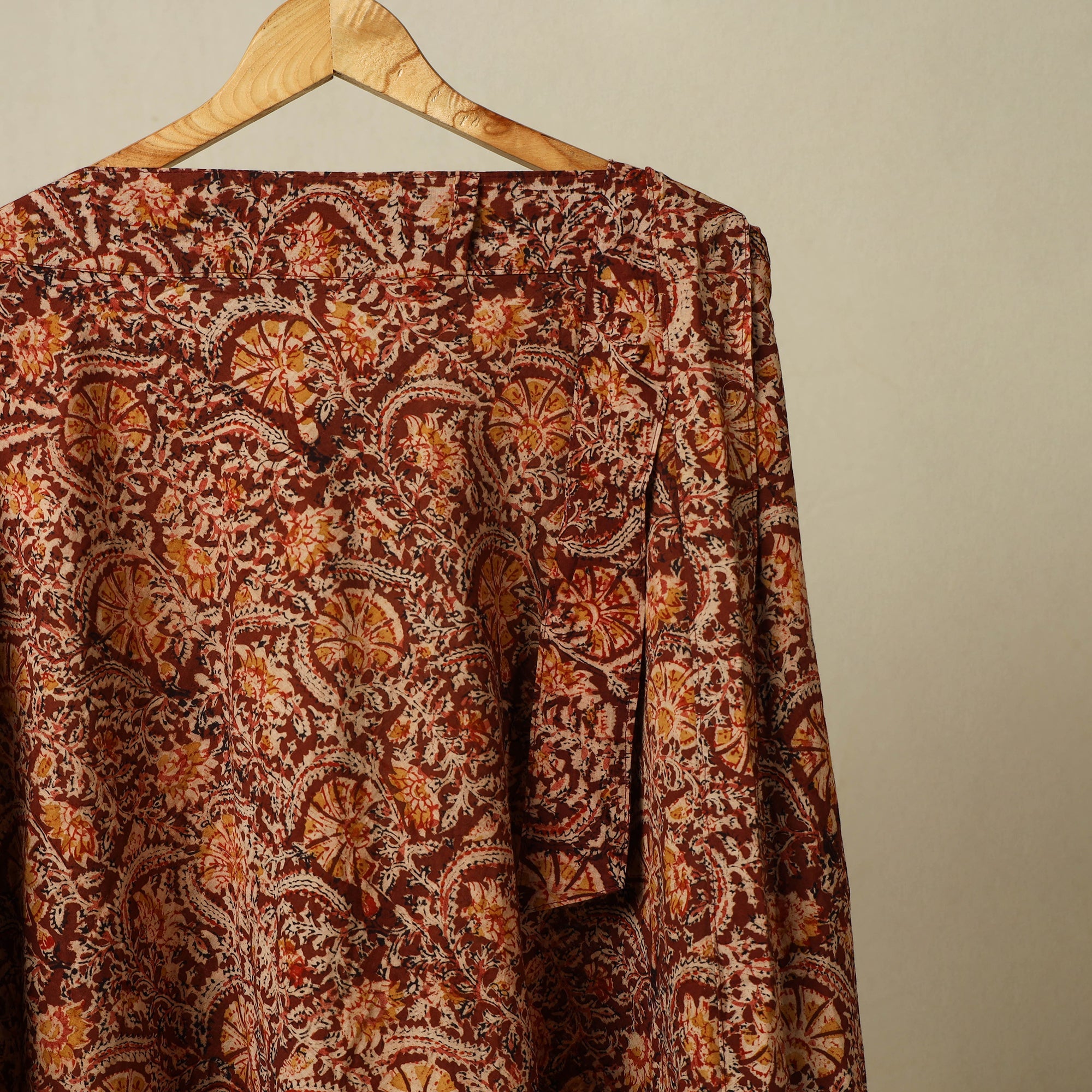 Add charm to your wardrobe with this maroon kalamkari block print cotton wrap-around skirt. Designed with a tie-up waist closure, it combines everyday comfort with ethnic grace. Showcasing hand block-printed motifs inspired by traditional kalamkari art, this skirt is perfect for daily wear, vacations, or relaxed festive styling.