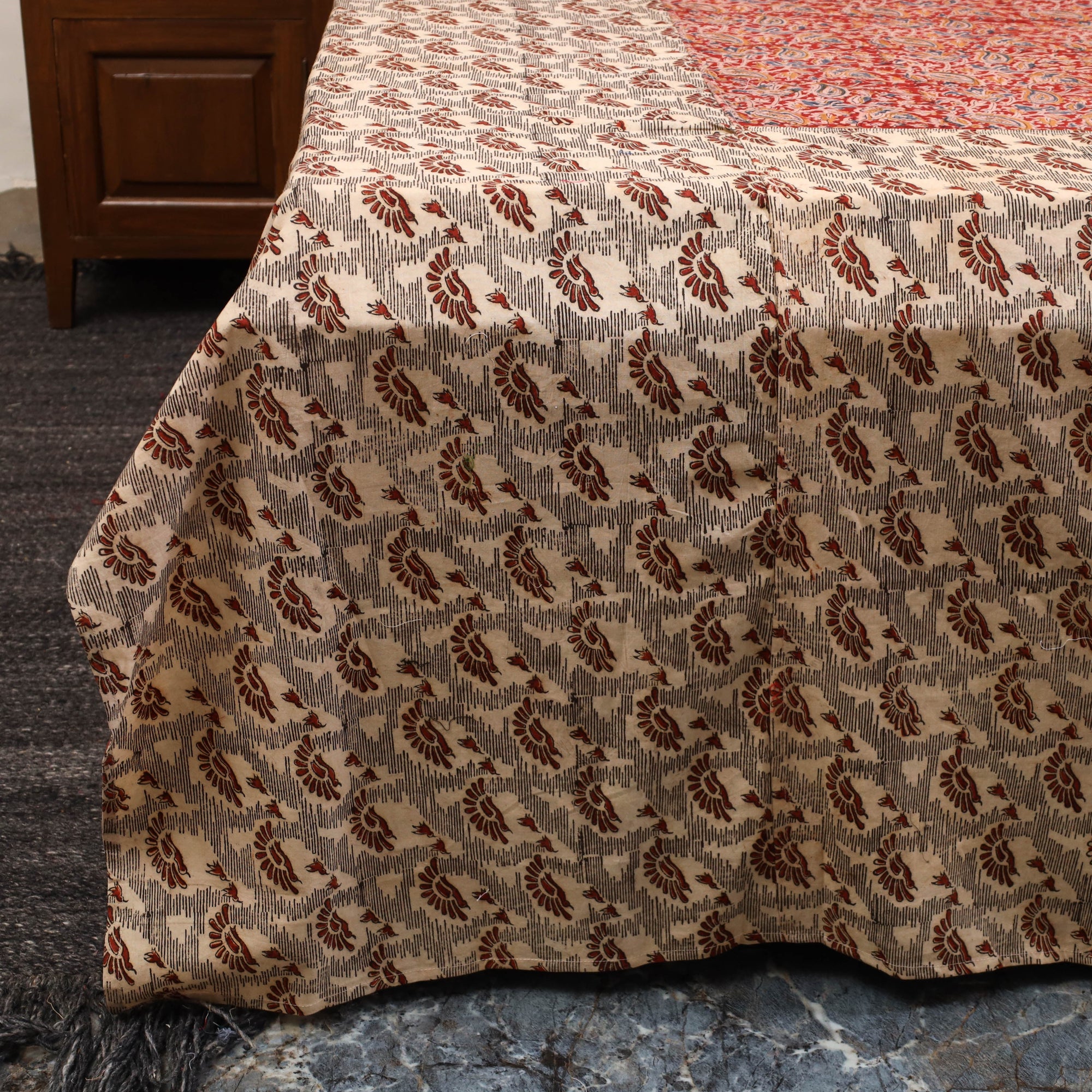 Beige pure cotton bedsheet set features a beautiful blend of kalamkari block print patchwork, combining traditional artistry with a modern touch. Made from breathable cotton, it offers lasting comfort and everyday durability. The detailed patchwork design adds a charming, artisanal feel to your space. The set includes one double bedsheet and two matching pillow covers, perfect for enhancing your home decor.
