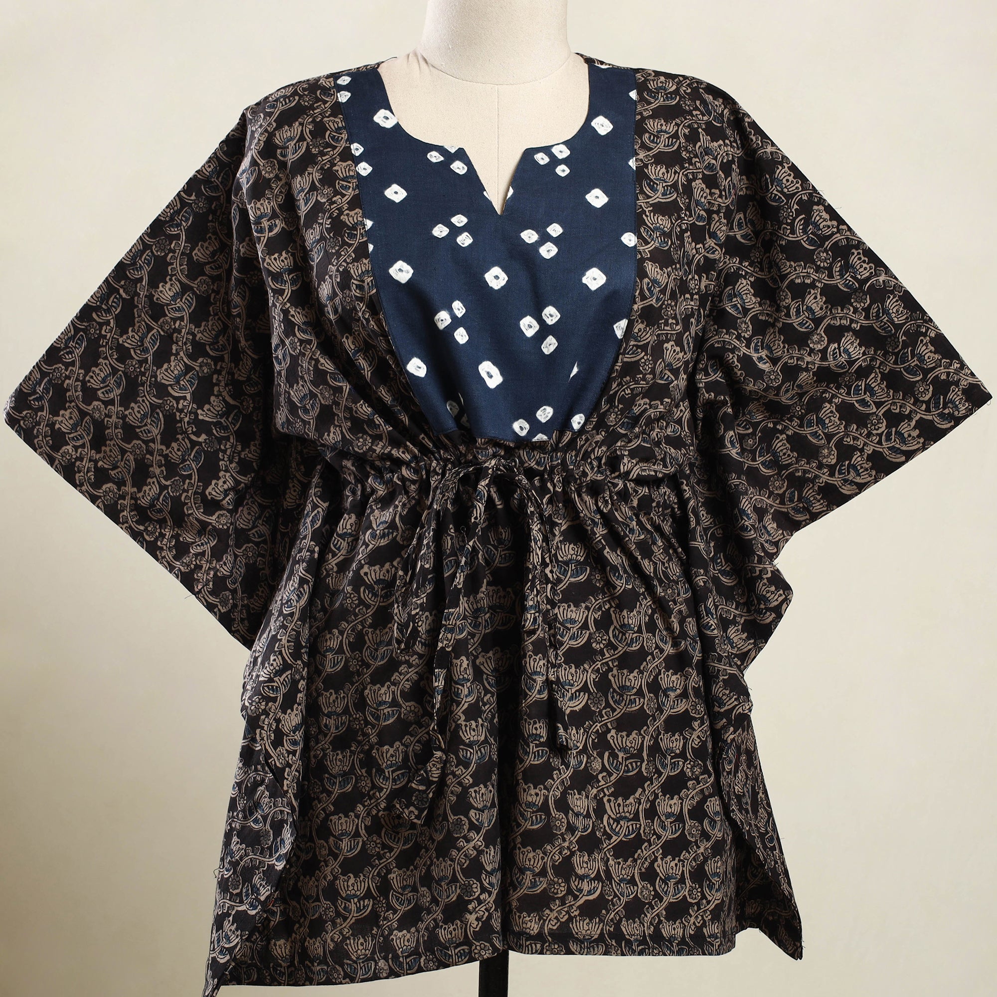 Enjoy effortless comfort in this black kalamkari block print patchwork kaftan. Made from soft, breathable cotton, it features a drawstring waist for an adjustable fit. Perfect for lounging at home or stepping out for casual outings, this kaftan offers a relaxed feel with just the right touch of style.