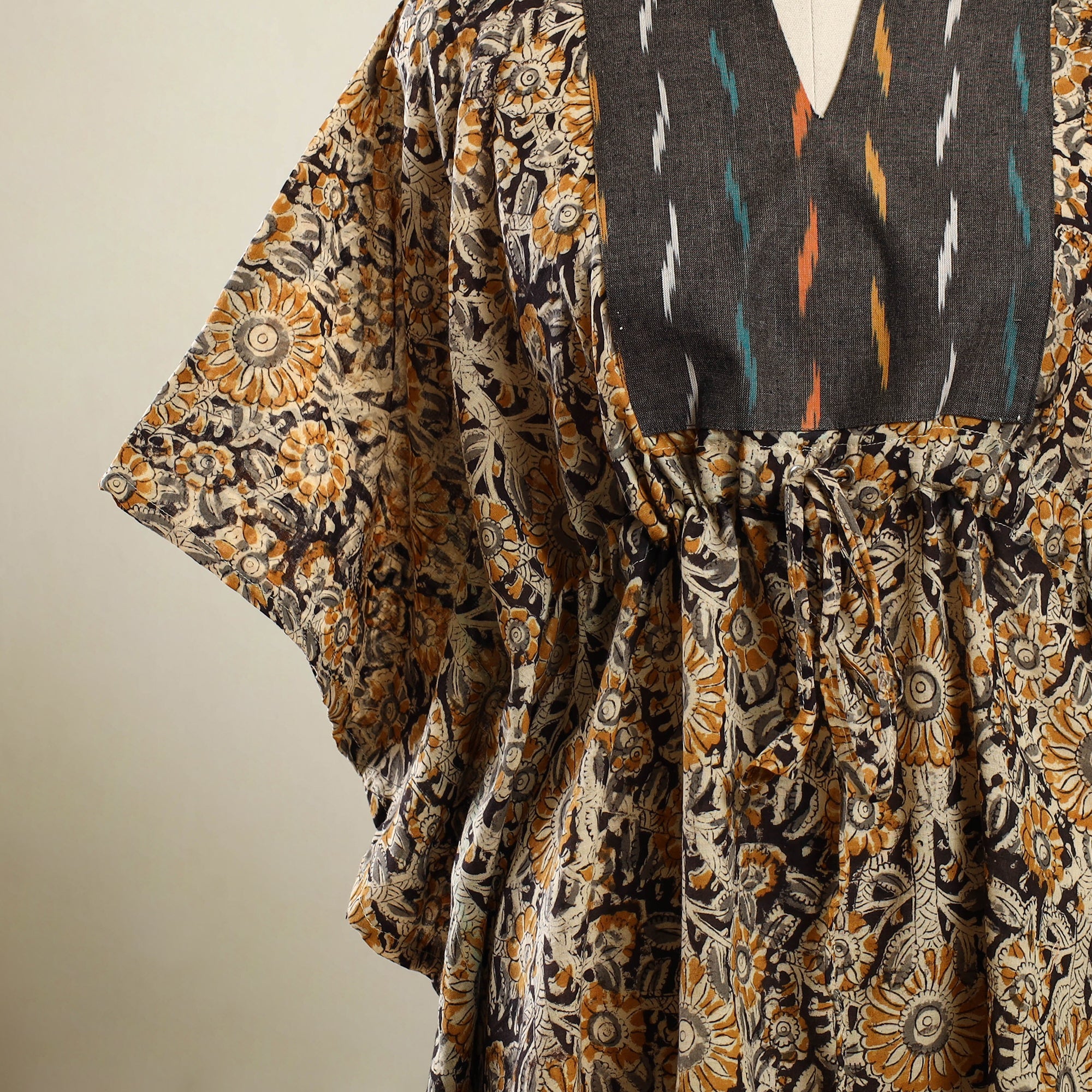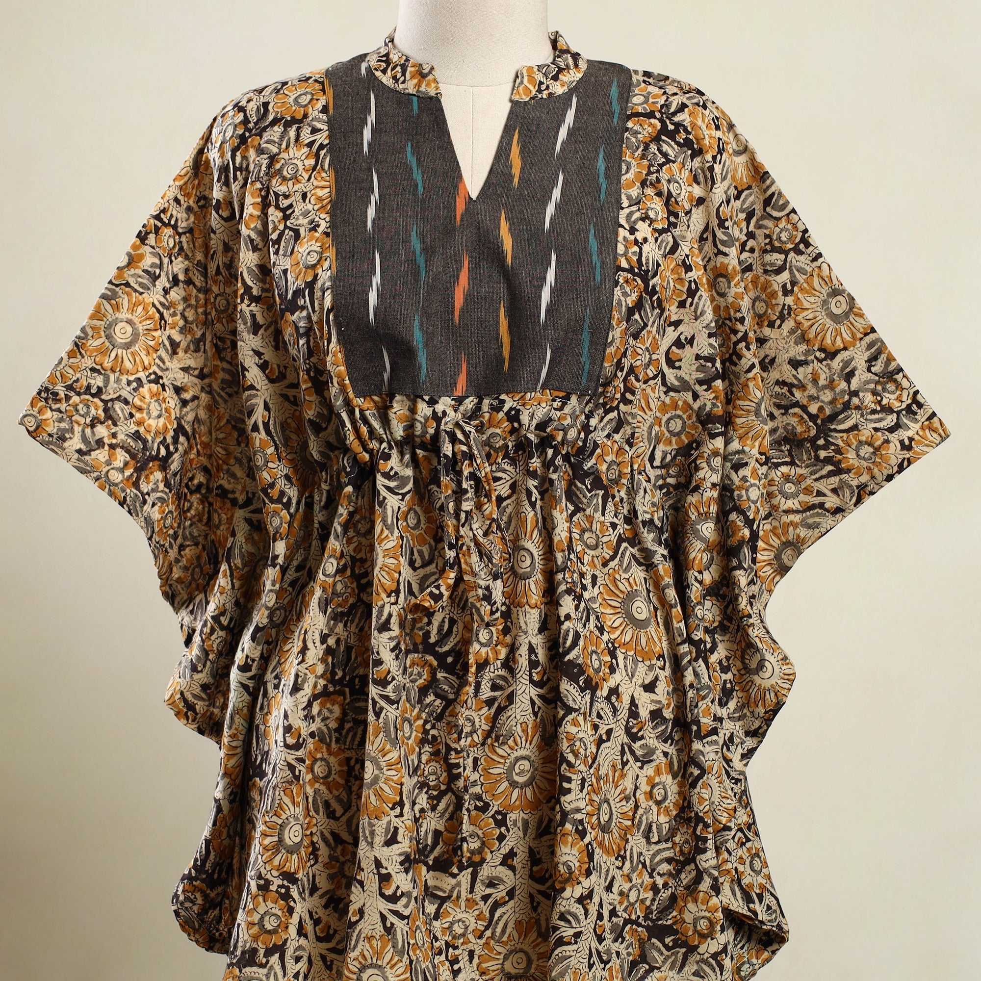 Enjoy effortless comfort in this beigekalamkari block print patchwork kaftan. Made from soft, breathable cotton, it features a drawstring waist for an adjustable fit. Perfect for lounging at home or stepping out for casual outings, this kaftan offers a relaxed feel with just the right touch of style.
