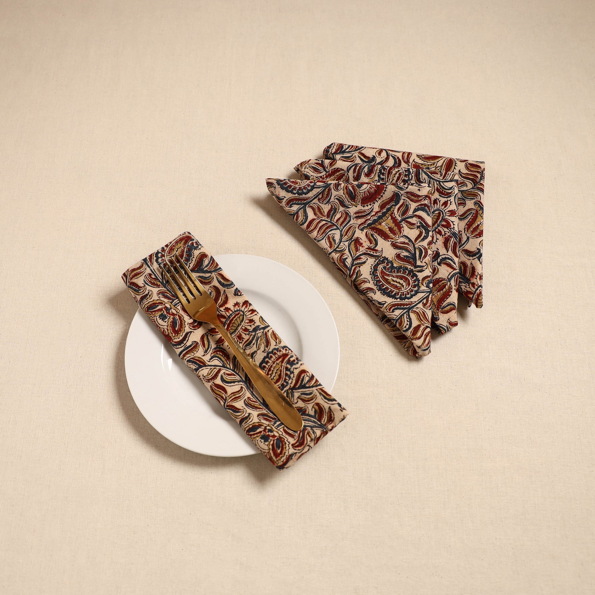 Add a touch of charm to your dining table with this kalamkari block print table napkin set. Made from soft cotton, these napkins feel gentle and comfortable for everyday use, making them ideal for daily dining, casual meals and special table settings.