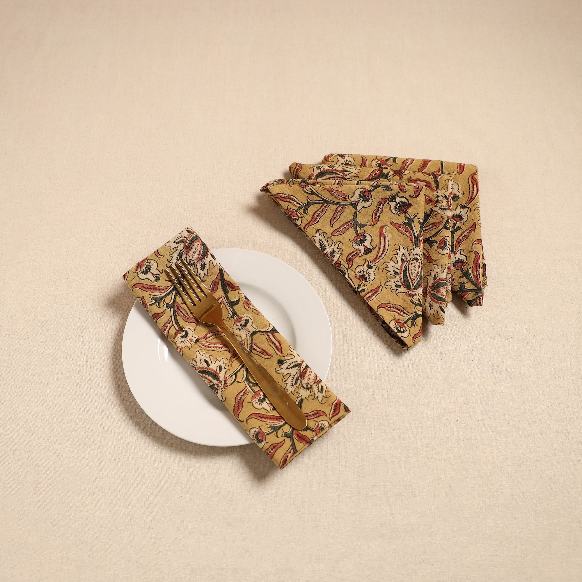 Add a touch of charm to your dining table with this kalamkari block print table napkin set. Made from soft cotton, these napkins feel gentle and comfortable for everyday use, making them ideal for daily dining, casual meals and special table settings.