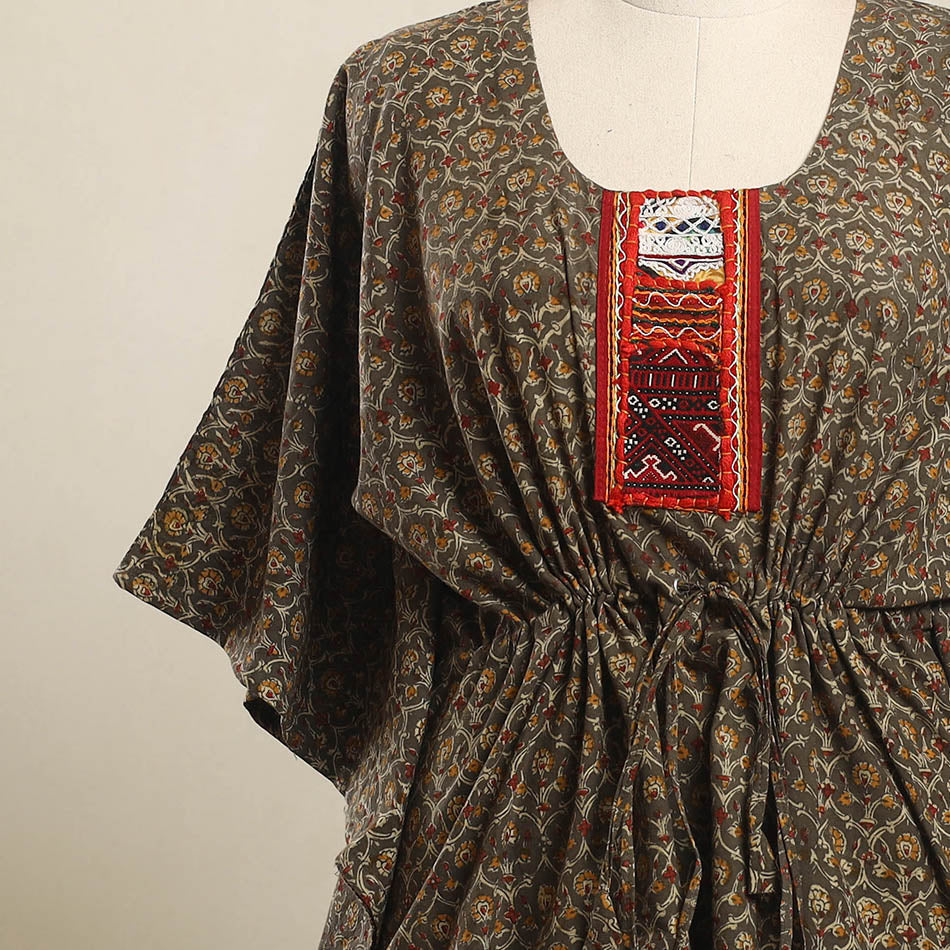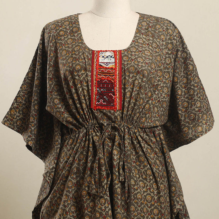 Stay stylish and comfortable with this brown kalamkari block print cotton kaftan, adorned with desert thread embroidery and designed for a relaxed fit. Made from lightweight cotton, this kaftan features flowy sleeves and a drawstring waist for an adjustable look. Perfect for lounging, beach outings, or casual wear, its soft fabric ensures all day ease.