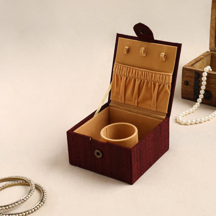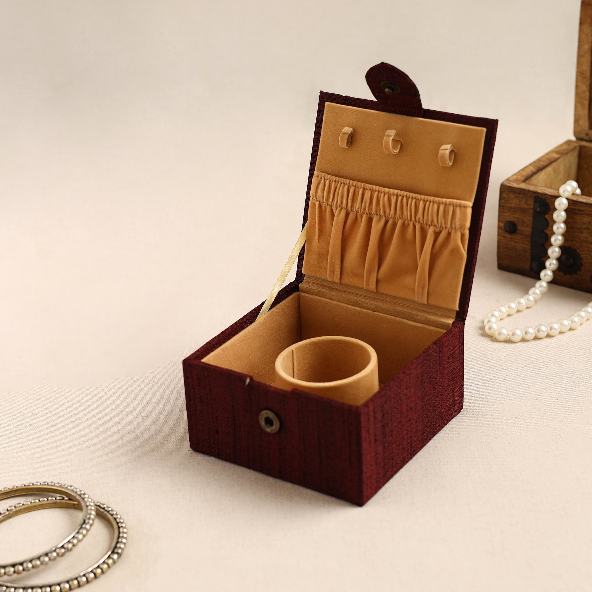 Material Organize your bangles in style with our "Bamboo Kalam’s" maroon kalamkari handpainted ghicha silk bangle box. This exquisite jewelry box is made from craft board and emblished with natural dyed cotton & ghicha silk fabric. Soft velvet fabric is used inside this jewelry box which protects your precious jewelry from scratches and breakage. This elegant storage box blends traditional artistry with practical utility, perfect for keeping your precious bangles safe and organized. Featuring intricate kalamkari designs, it highlights the timeless craftsmanship of Indian artisans. Add a touch of your dressing space.