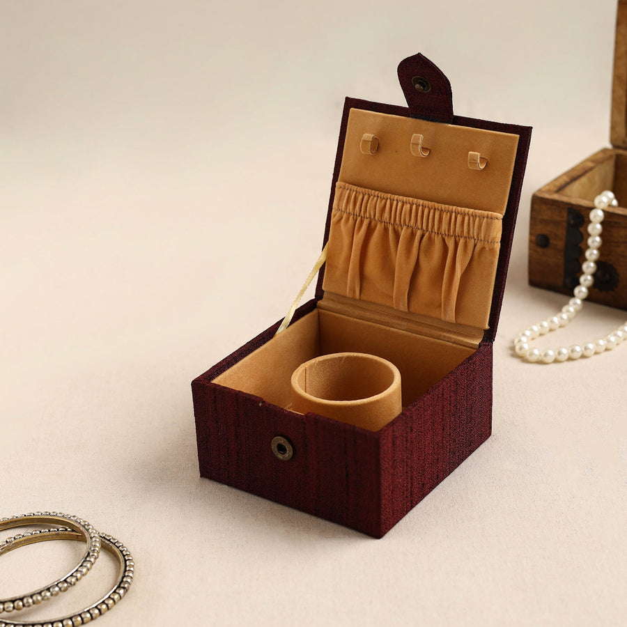 Material Organize your bangles in style with our "Bamboo Kalam’s" maroon kalamkari handpainted ghicha silk bangle box. This exquisite jewelry box is made from craft board and emblished with natural dyed cotton & ghicha silk fabric. Soft velvet fabric is used inside this jewelry box which protects your precious jewelry from scratches and breakage. This elegant storage box blends traditional artistry with practical utility, perfect for keeping your precious bangles safe and organized. Featuring intricate kalamkari designs, it highlights the timeless craftsmanship of Indian artisans. Add a touch of your dressing space.