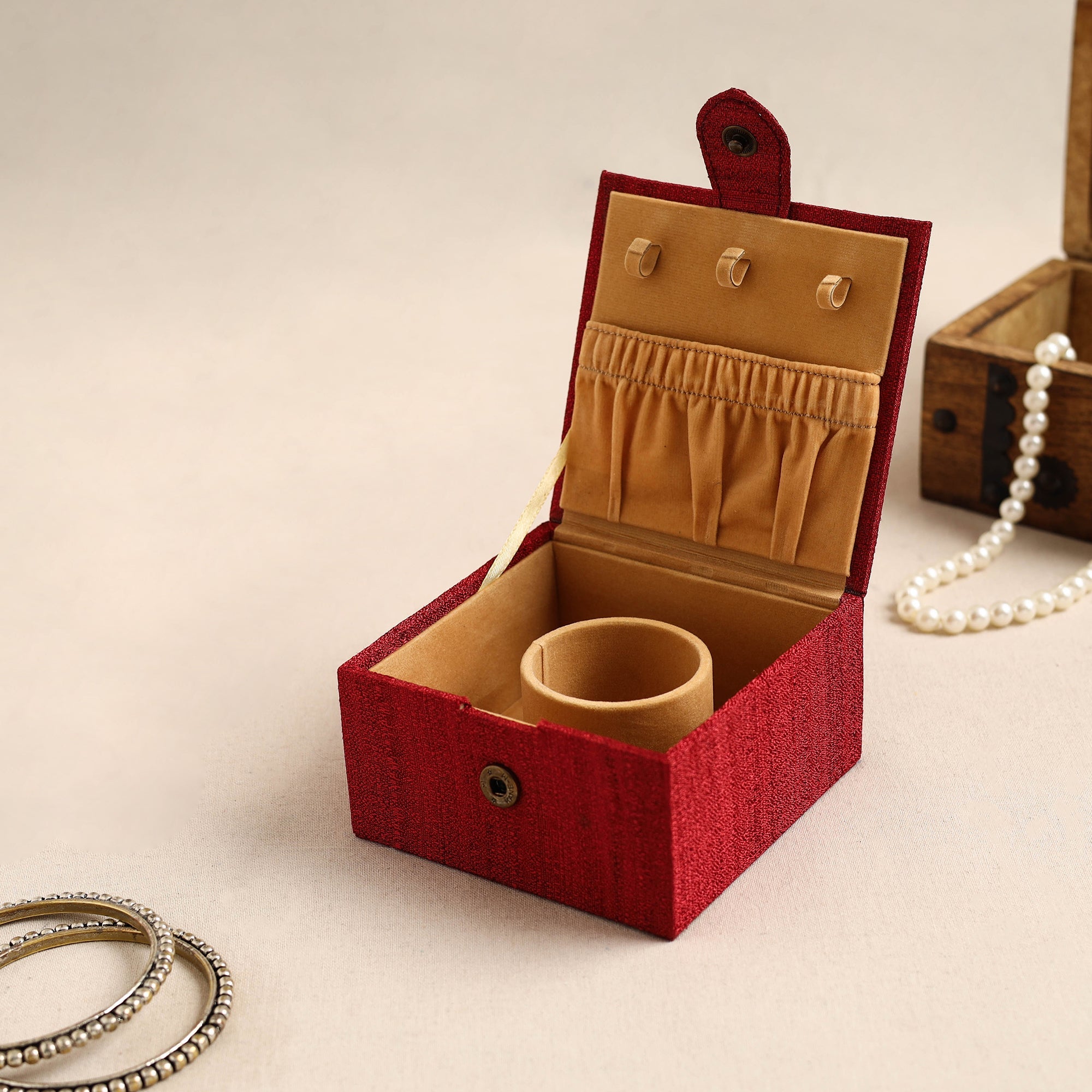 Material Organize your bangles in style with our "Bamboo Kalam’s" red kalamkari handpainted ghicha silk bangle box. This exquisite jewelry box is made from craft board and emblished with natural dyed cotton & ghicha silk fabric. Soft velvet fabric is used inside this jewelry box which protects your precious jewelry from scratches and breakage. This elegant storage box blends traditional artistry with practical utility, perfect for keeping your precious bangles safe and organized. Featuring intricate kalamkari designs, it highlights the timeless craftsmanship of Indian artisans. Add a touch of your dressing space.