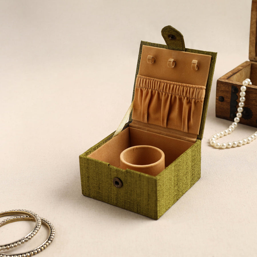 Organize your bangles in style with our "Bamboo Kalam’s" green kalamkari handpainted ghicha silk bangle box. This exquisite jewelry box is made from craft board and emblished with natural dyed cotton & ghicha silk fabric. Soft velvet fabric is used inside this jewelry box which protects your precious jewelry from scratches and breakage. This elegant storage box blends traditional artistry with practical utility, perfect for keeping your precious bangles safe and organized. Featuring intricate kalamkari designs, it highlights the timeless craftsmanship of Indian artisans. Add a touch of your dressing space.