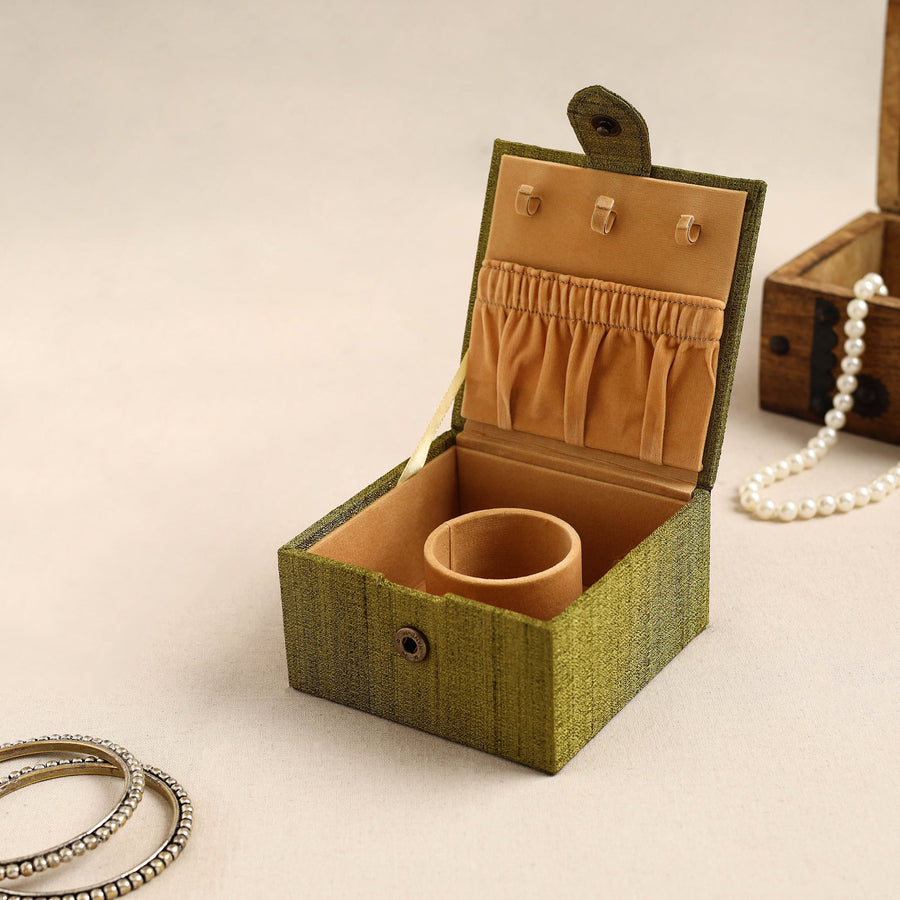 Organize your bangles in style with our "Bamboo Kalam’s" green kalamkari handpainted ghicha silk bangle box. This exquisite jewelry box is made from craft board and emblished with natural dyed cotton & ghicha silk fabric. Soft velvet fabric is used inside this jewelry box which protects your precious jewelry from scratches and breakage. This elegant storage box blends traditional artistry with practical utility, perfect for keeping your precious bangles safe and organized. Featuring intricate kalamkari designs, it highlights the timeless craftsmanship of Indian artisans. Add a touch of your dressing space.