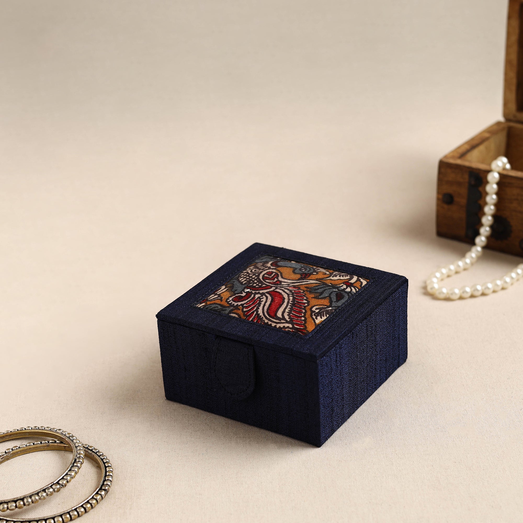 Organize your bangles in style with our "Bamboo Kalam’s" blue kalamkari handpainted ghicha silk bangle box. This exquisite jewelry box is made from craft board and emblished with natural dyed cotton & ghicha silk fabric. Soft velvet fabric is used inside this jewelry box which protects your precious jewelry from scratches and breakage. This elegant storage box blends traditional artistry with practical utility, perfect for keeping your precious bangles safe and organized. Featuring intricate kalamkari designs, it highlights the timeless craftsmanship of Indian artisans. Add a touch of your dressing space.