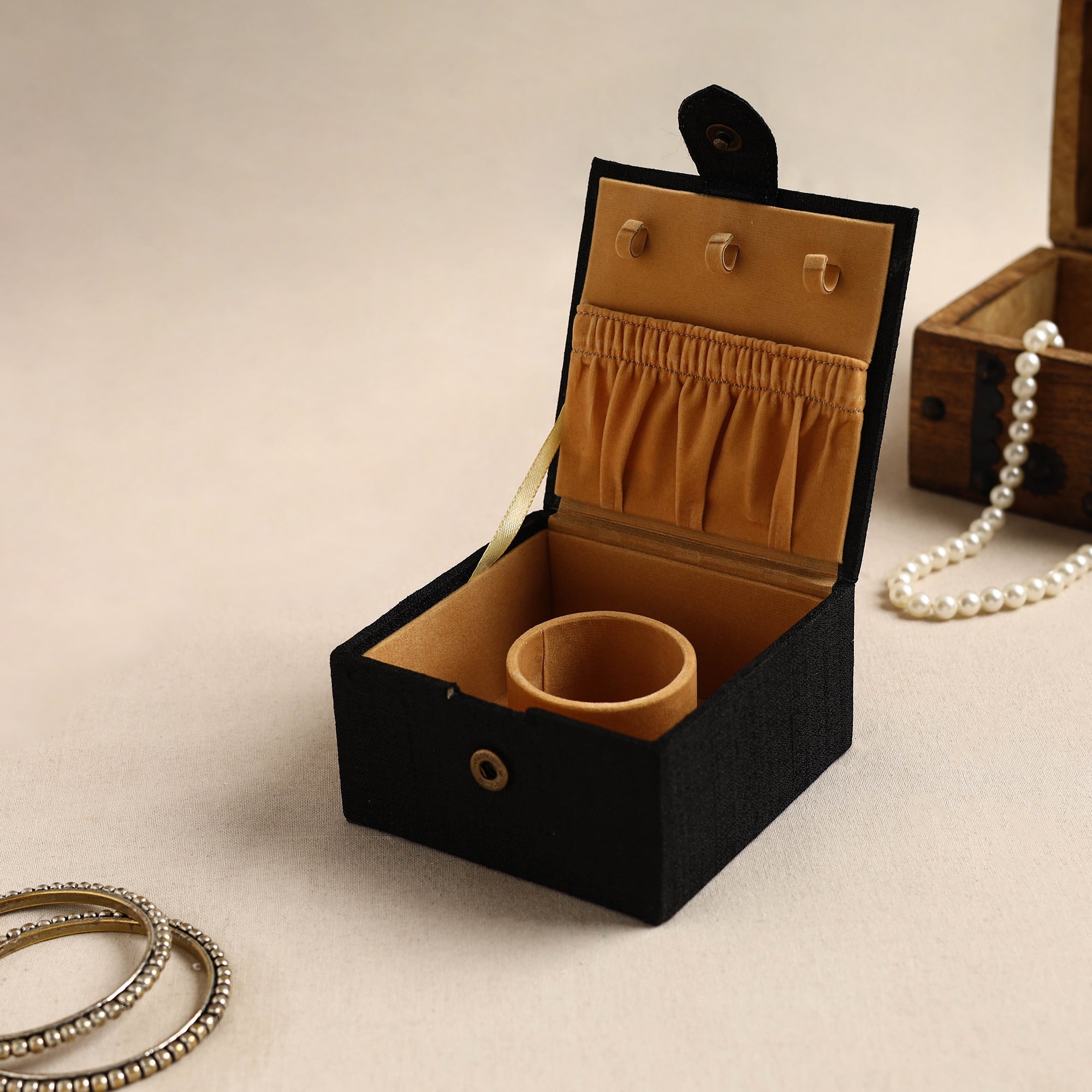 Organize your bangles in style with our "Bamboo Kalam’s" black kalamkari handpainted ghicha silk bangle box. This exquisite jewelry box is made from craft board and emblished with natural dyed cotton & ghicha silk fabric. Soft velvet fabric is used inside this jewelry box which protects your precious jewelry from scratches and breakage. This elegant storage box blends traditional artistry with practical utility, perfect for keeping your precious bangles safe and organized. Featuring intricate kalamkari designs, it highlights the timeless craftsmanship of Indian artisans. Add a touch of your dressing space.