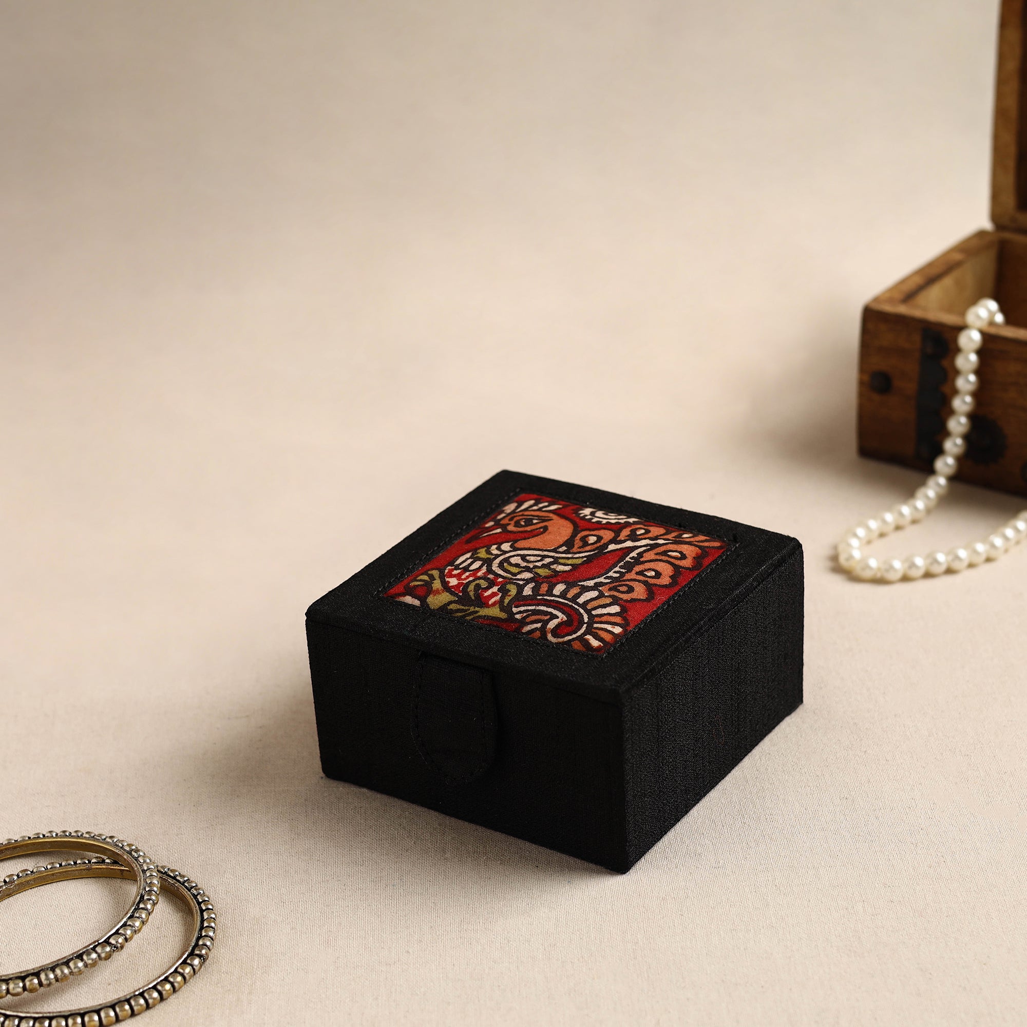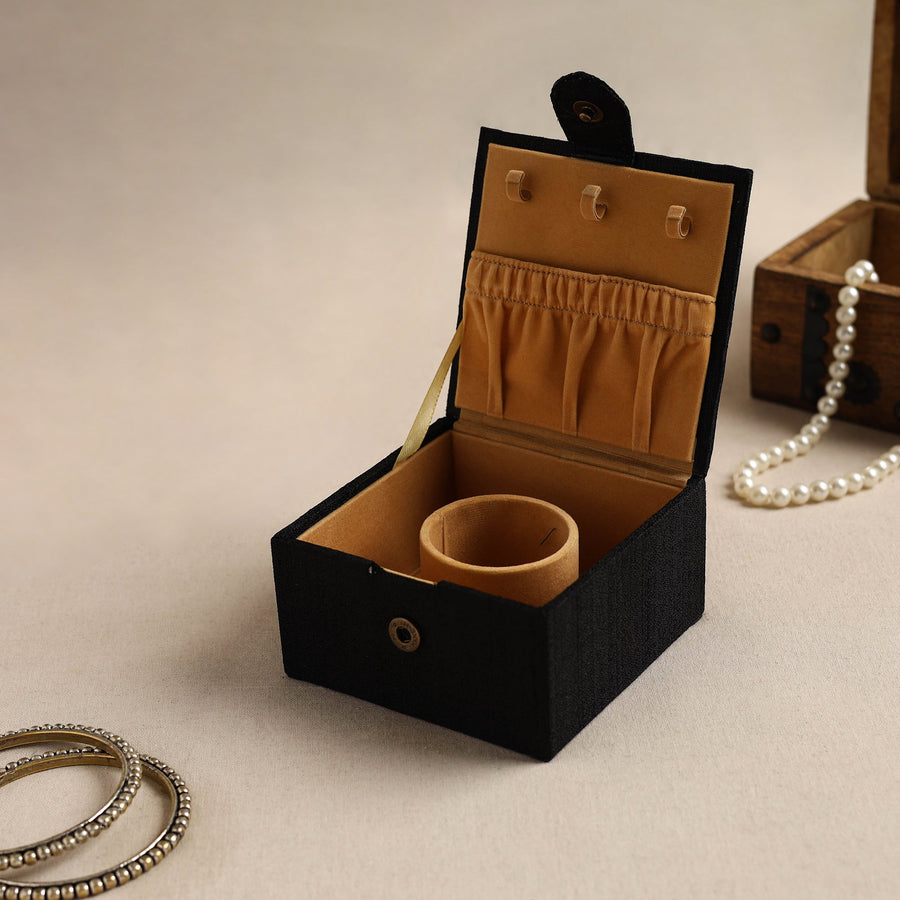 Organize your bangles in style with our "Bamboo Kalam’s" black kalamkari handpainted ghicha silk bangle box. This exquisite jewelry box is made from craft board and emblished with natural dyed cotton & ghicha silk fabric. Soft velvet fabric is used inside this jewelry box which protects your precious jewelry from scratches and breakage. This elegant storage box blends traditional artistry with practical utility, perfect for keeping your precious bangles safe and organized. Featuring intricate kalamkari designs, it highlights the timeless craftsmanship of Indian artisans. Add a touch of your dressing space.