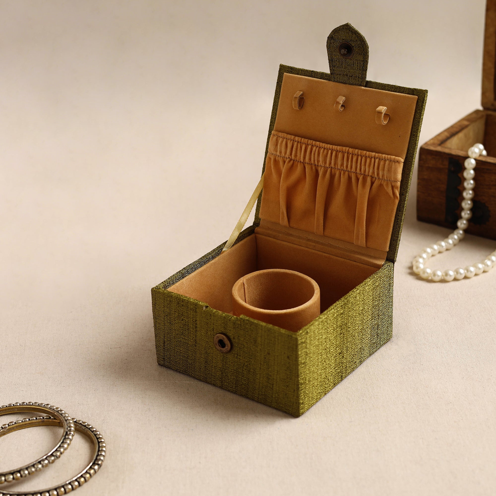 Organize your bangles in style with our "Bamboo Kalam’s" green kalamkari handpainted ghicha silk bangle box. This exquisite jewelry box is made from craft board and emblished with natural dyed cotton & ghicha silk fabric. Soft velvet fabric is used inside this jewelry box which protects your precious jewelry from scratches and breakage. This elegant storage box blends traditional artistry with practical utility, perfect for keeping your precious bangles safe and organized. Featuring intricate kalamkari designs, it highlights the timeless craftsmanship of Indian artisans. Add a touch of your dressing space.