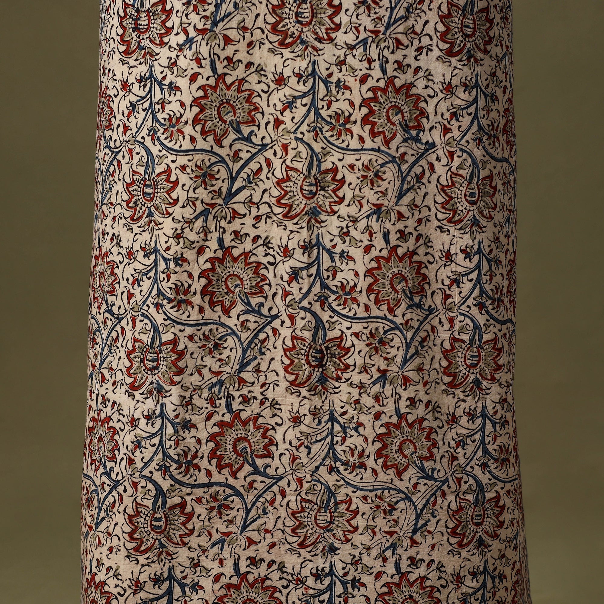 This beige kalamkari hand block-printed cotton kurta material is soft, breathable, and ideal for everyday comfort. The front neckline showcases a handcrafted patchwork design, bringing in a distinctive handmade charm. Perfect for creating relaxed kurtas, elegant office styles, or easy-going casual wear. Choose your silhouette and tailor it to your liking.