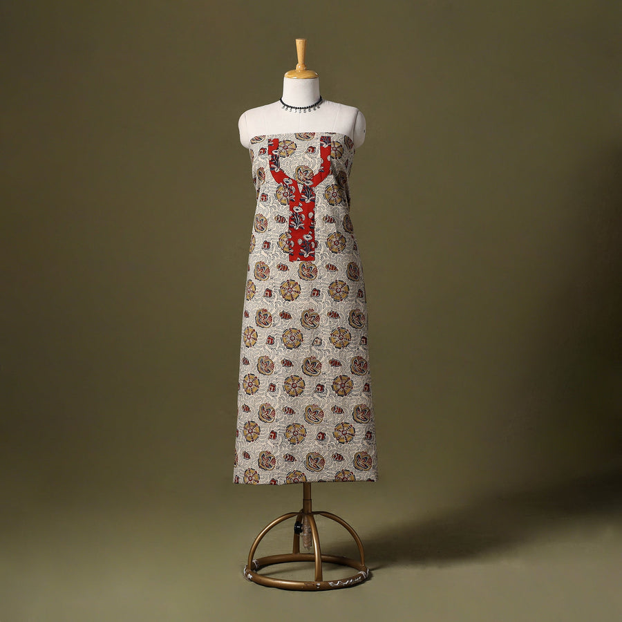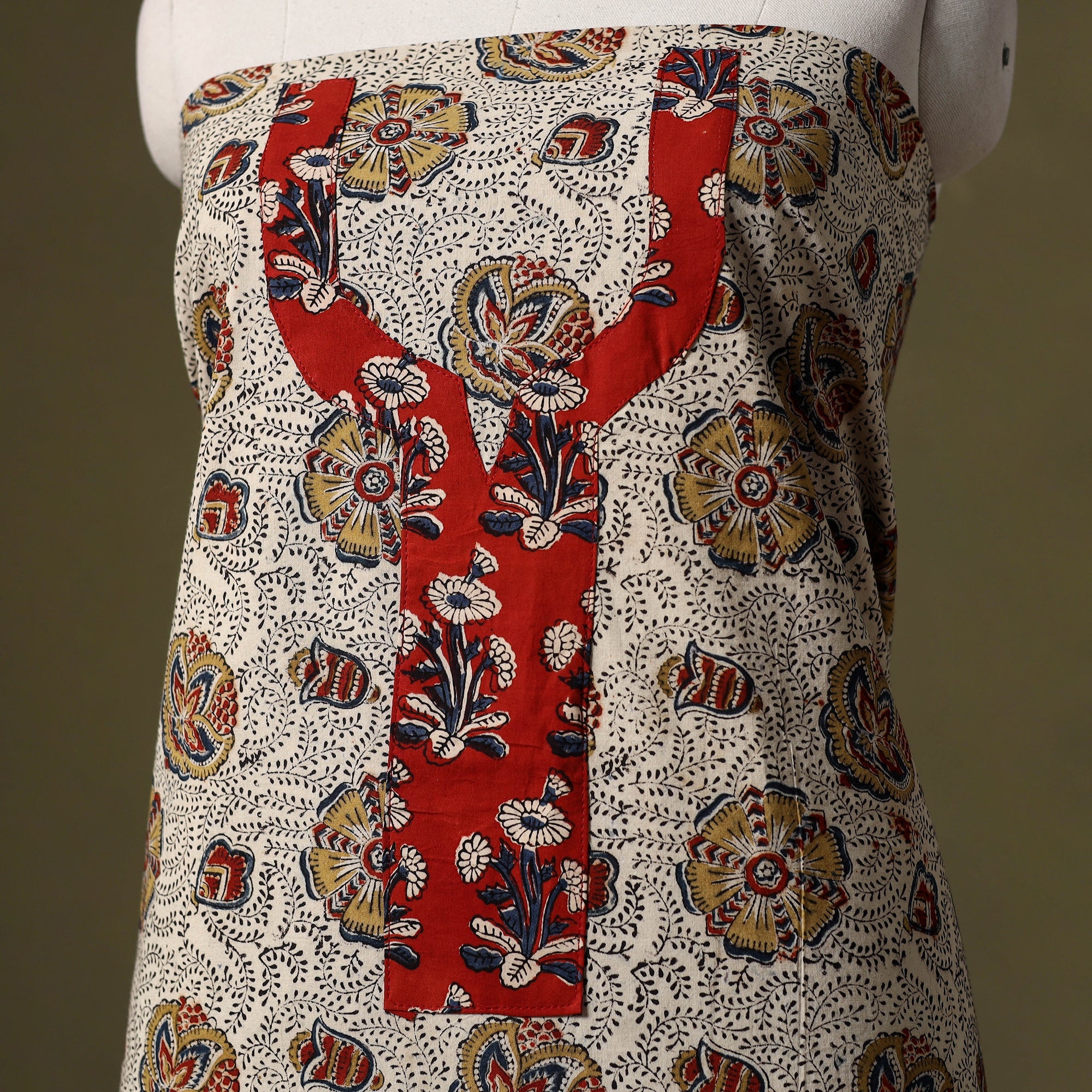 This beige kalamkari hand block-printed cotton kurta material is soft, breathable, and ideal for everyday comfort. The front neckline showcases a handcrafted patchwork design, bringing in a distinctive handmade charm. Perfect for creating relaxed kurtas, elegant office styles, or easy-going casual wear. Choose your silhouette and tailor it to your liking.