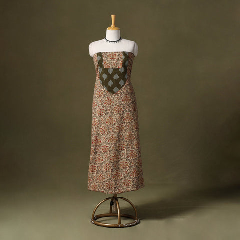 This beige kalamkari hand block-printed cotton kurta material is soft, breathable, and ideal for everyday comfort. The front neckline showcases a handcrafted patchwork design, bringing in a distinctive handmade charm. Perfect for creating relaxed kurtas, elegant office styles, or easy-going casual wear. Choose your silhouette and tailor it to your liking.