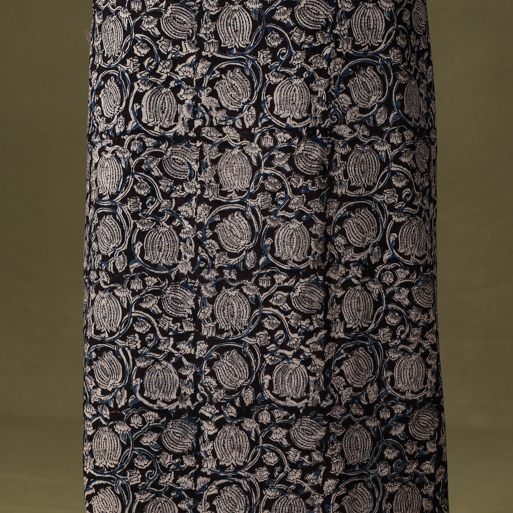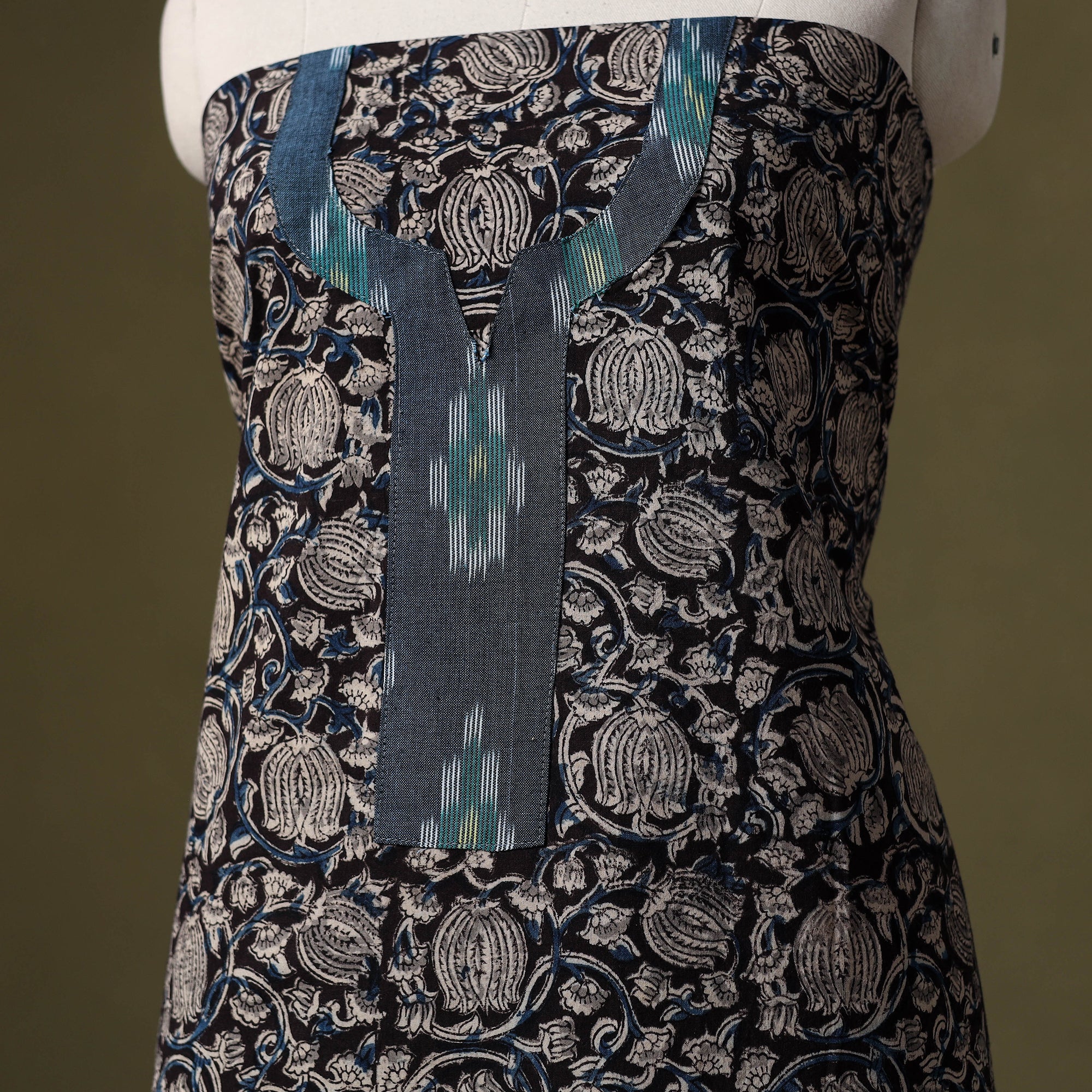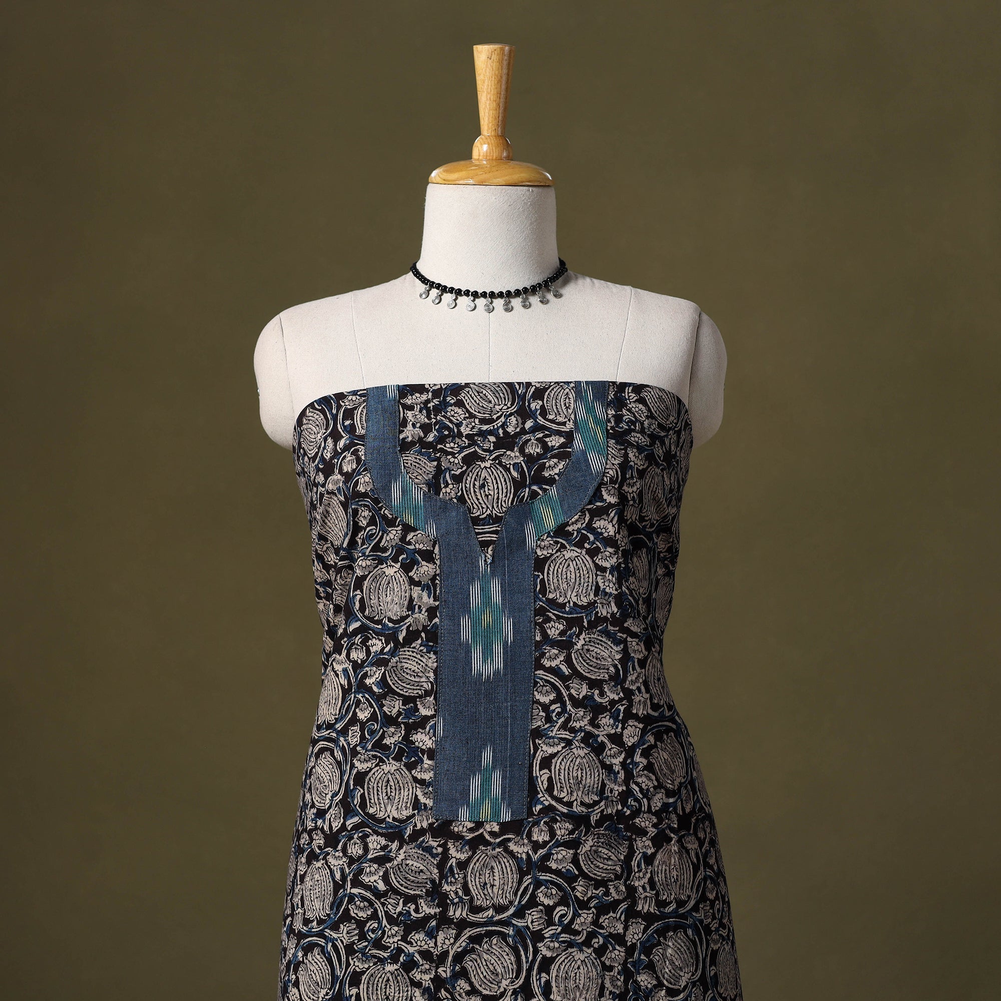 This black kalamkari hand block-printed cotton kurta material is soft, breathable, and ideal for everyday comfort. The front neckline showcases a handcrafted patchwork design, bringing in a distinctive handmade charm. Perfect for creating relaxed kurtas, elegant office styles, or easy-going casual wear. Choose your silhouette and tailor it to your liking.